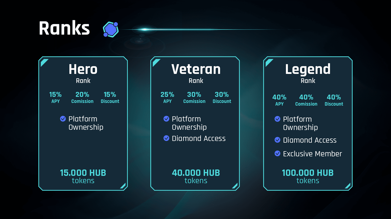 🏆Posiadacze tokenów otrzymują przywilej stawiania swoich tokenów HUB, osiągając w ten sposób poziom rangi na platformie. Ten ranking odblokowuje następujące korzyści: