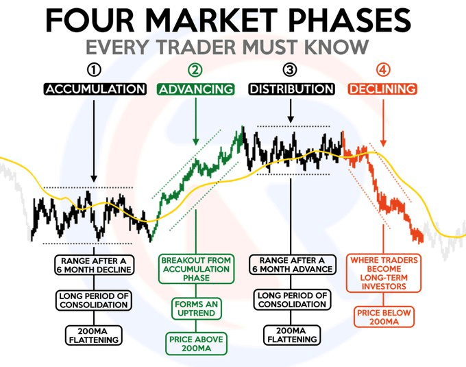 Typowy cykl ma wyraźne fazy — zaczynając od cichej akumulacji, a następnie silnego wzrostu, gdy więcej inwestorów wchodzi na rynek.