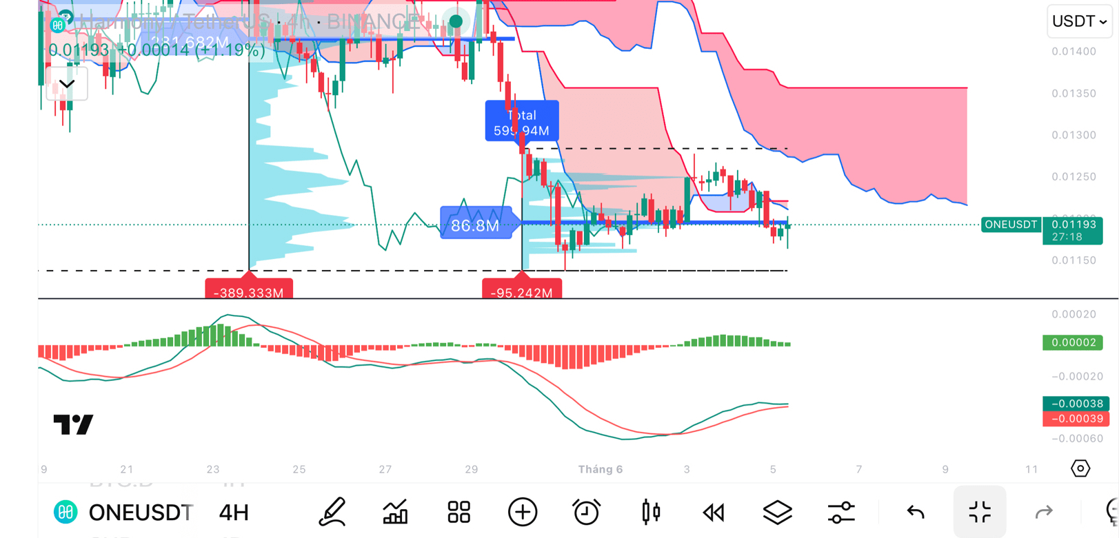 1. Chmura Ichimoku: Obecna cena znajduje się poniżej czerwonej chmury – główny trend nadal jest spadkowy. Przednia chmura nadal gruba i czerwona, co wskazuje, że sprzedający mają kontrolę.