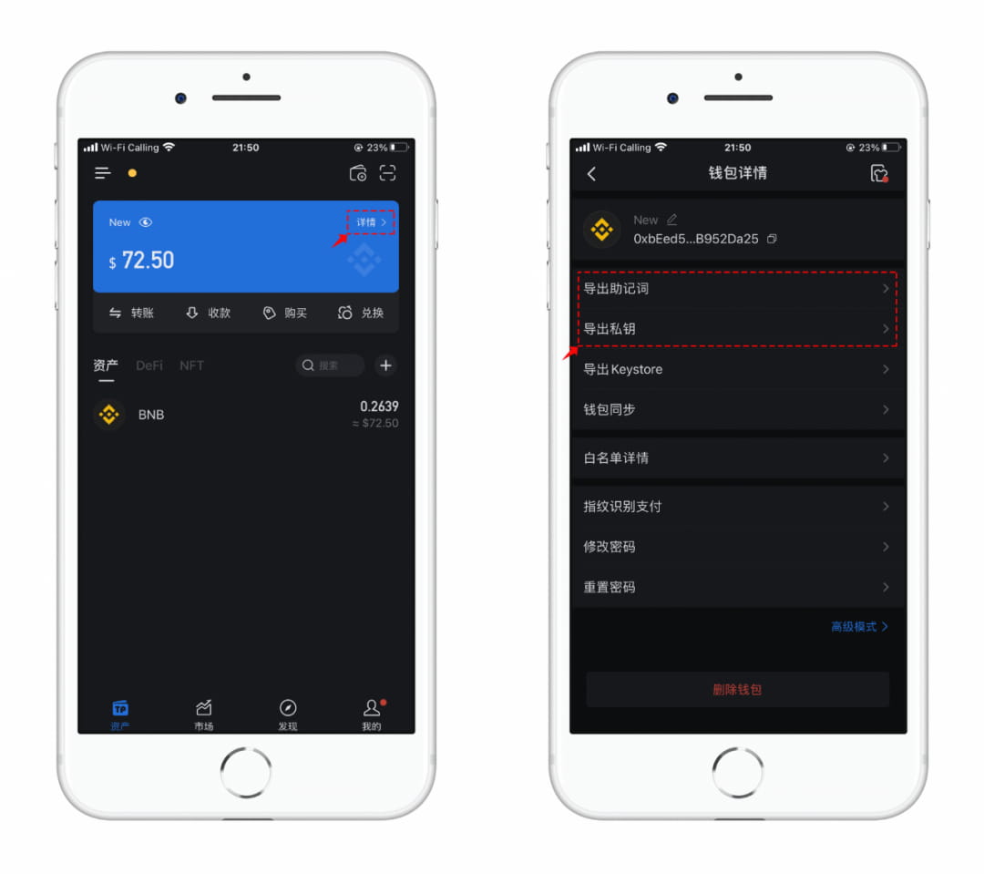Otwórz stronę zasobu TokenPocket > Szczegóły > Eksportuj frazę mnemoniczną/klucz prywatny