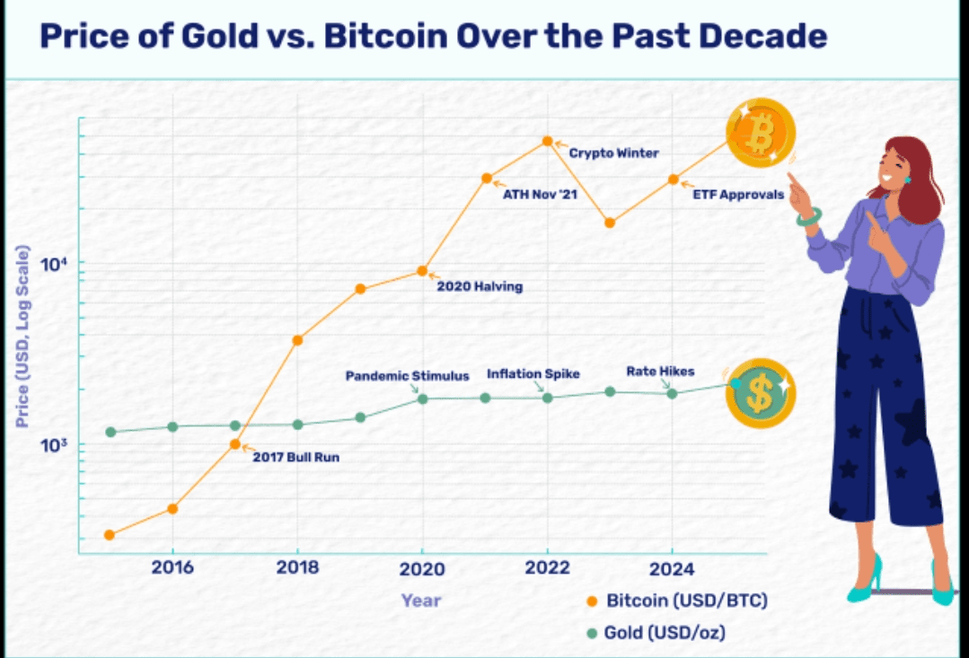 Kapitalizacja rynkowa i adopcja: Kapitalizacja rynkowa złota i jego obecność w instytucjach pozostają duże, ale wzrost BTC był eksplozjowy i jest coraz częściej traktowany jako cyfrowy magazyn wartości.