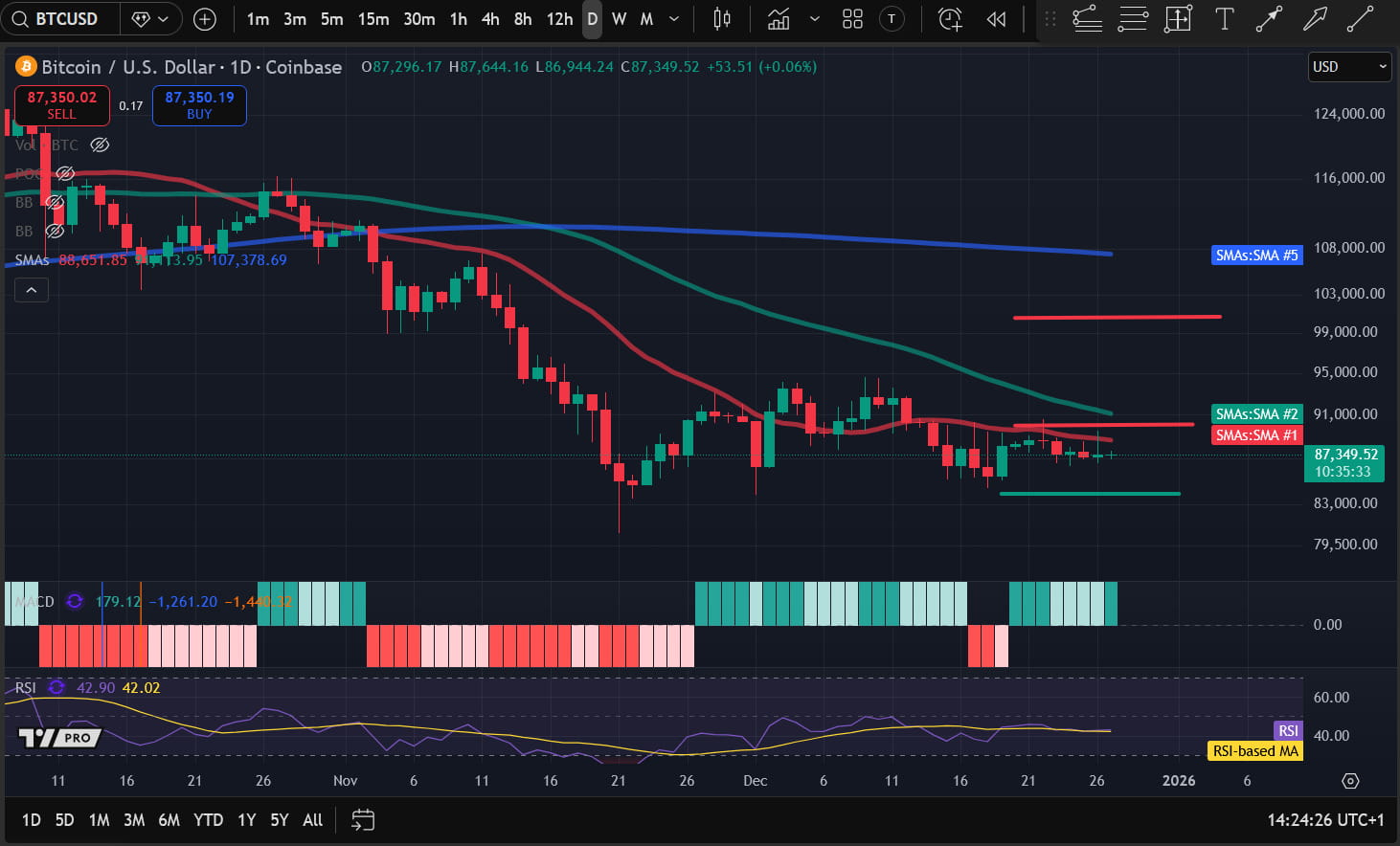 Bitcoin (BTC) ma trudności z budowaniem impetu z powodu niskich poziomów płynności w czasie świątecznym. Akcja cenowa flagowej kryptowaluty była stosunkowo stłumiona w tym tygodniu, z istotnym ruchem zarejestrowanym tylko w piątek, kiedy przez chwilę przekroczył poziom 89 000 USD do 89 496 USD. Jednak stracił impet i ustalił na 87 296 USD, ostatecznie rejestrując marginalny wzrost. Cena jest marginalnie wyższa podczas trwającej sesji, handlując wokół 87 431 USD.