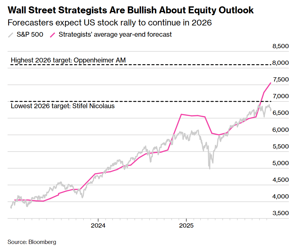 Mimo że rynek kryptowalut i metali szlachetnych wykazuje dużą zmienność, Wall Street prezentuje rzadko spotykany optymizm w odniesieniu do akcji amerykańskich. Zgodnie z badaniami przeprowadzonymi przez Bloomberg wśród 21 analityków, żaden z nich nie przewiduje spadku na rynku akcji w 2026 roku, a średnie prognozy wskazują na wzrost indeksu S&P 500 o kolejne 9%.