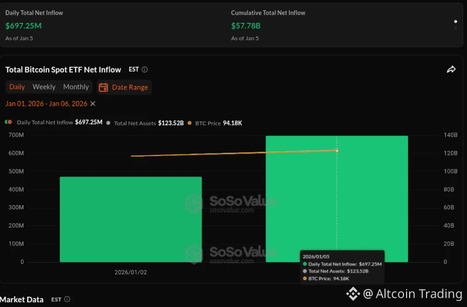 Спрос со стороны институциональных инвесторов тоже сохраняется. На спотовые биткоин-ETF 5 января пришлись чистые притоки примерно на $697 млн, а общий объем притока близок к $58 млрд.