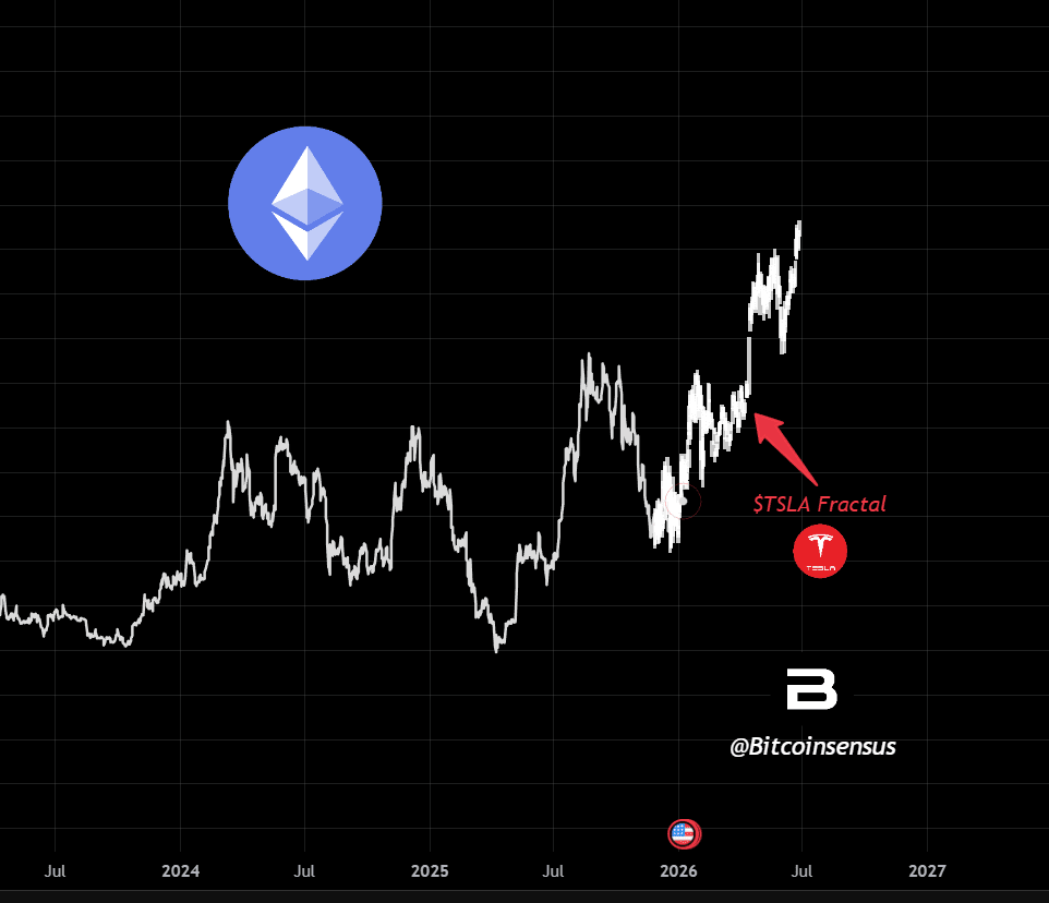 Sprawdź obraz, który mamy na stole: analizujemy fraktal, który porównuje ruch ETH do zachowania historycznego Tesli ($TSLA). Zwróć uwagę na tę czerwoną strzałkę: oznacza punkt konsolidacji tuż przed wystrzałem w górę. Jeśli ten wzór się powtórzy — jak często się zdarza, gdy historia się powtarza na wykresach — Ethereum będzie na progu parabolicznego przełomu w połowie 2026 roku. To klasyczna struktura "cichego akumulowania", przed masowym naciśnięciem przycisku zakupowego przez instytucje. 📈