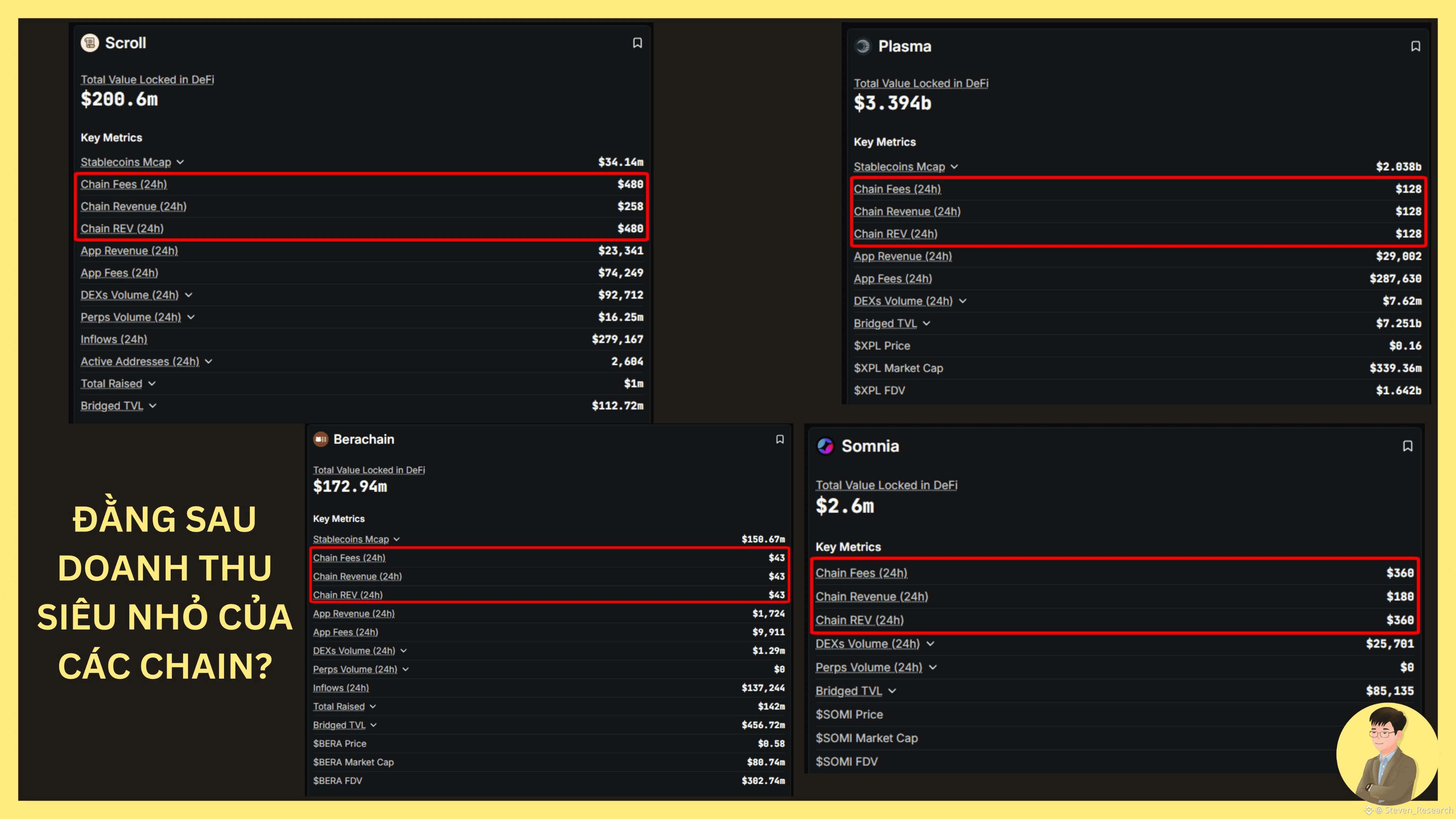 - VD: @Berachain: Đang giữ $173 triệu USD (TVL) và có tới $456 triệu USD tiền được chuyển cầu (Bridged TVL) vào, nhưng Chain chỉ thu được $43 tiền phí/ngày.
