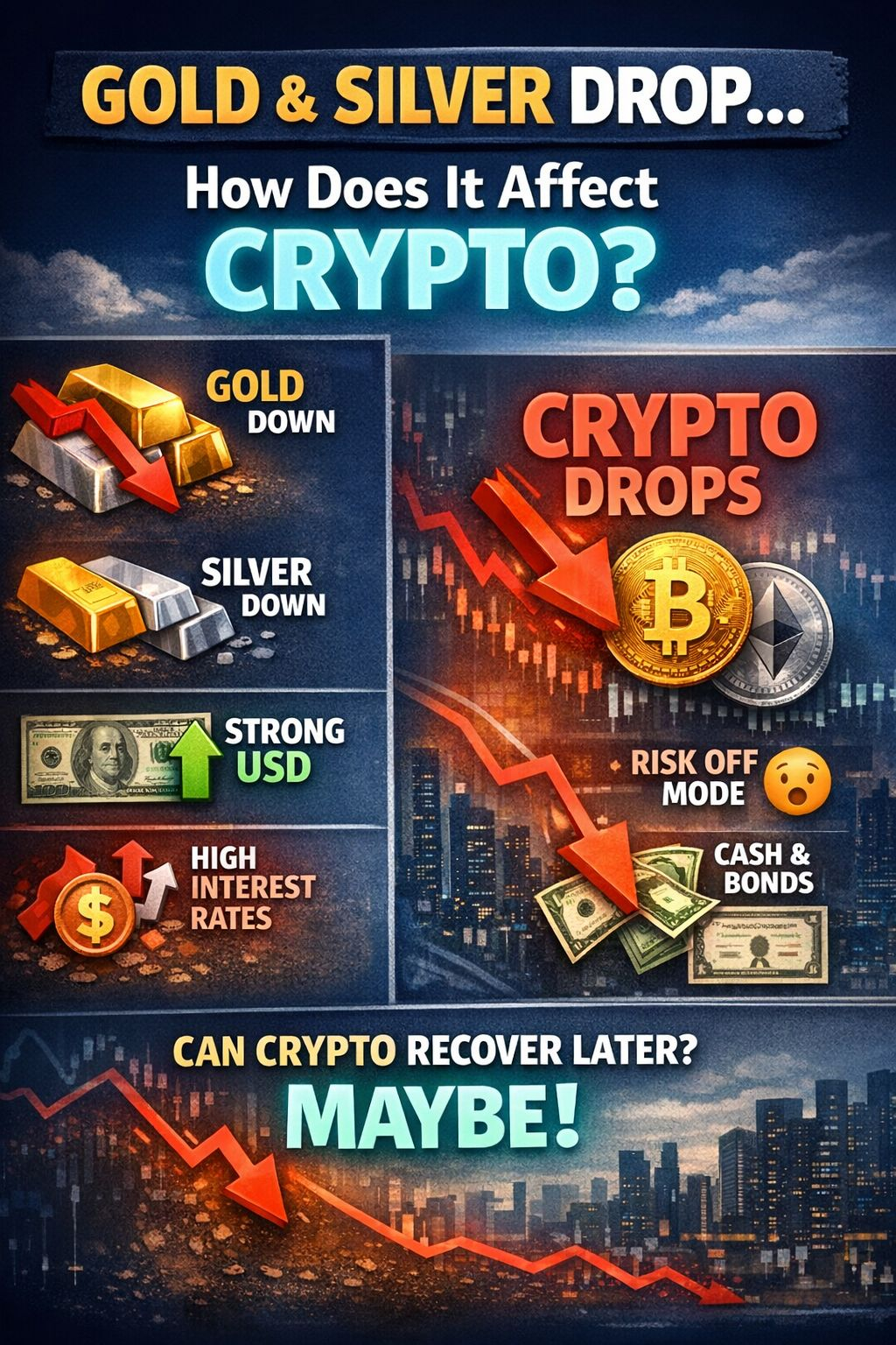 Ruchy na rynkach złota i srebra mogą pośrednio wpływać na rynek kryptowalut. Chociaż kryptowaluty nie podążają bezpośrednio za złotem lub srebrem, wszystkie są pod wpływem podobnych globalnych czynników, takich jak siła dolara amerykańskiego, stopy procentowe i nastroje inwestorów.