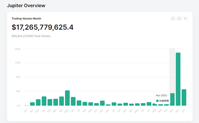 Jupiter jest jedynym konkurencyjnym agregatorem transakcji na platformie Solana, a duża część wolumenu transakcji w sieci Solana przechodzi przez firmę Jupiter. Patrząc na wolumen transakcji w listopadzie i grudniu, całkowity wolumen transakcji DEX w sieci Solana wyniósł odpowiednio 8 miliardów i 28 miliardów dolarów amerykańskich, podczas gdy łączny wolumen transakcji Jupitera w tych dwóch miesiącach wyniósł odpowiednio 3,9 miliarda dolarów i 17 miliardów dolarów amerykańskich . Z punktu widzenia wolumenu transakcji Jupiter jest liderem ponad połowy wolumenu transakcji DEX na Solanie, co oznacza, że użytkownicy częściej używają Jupitera do transakcji niż interfejsu DEX, naprawdę zdając sobie sprawę z istnienia DEX jako podstawowego protokołu płynności.