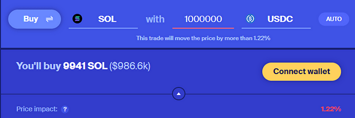 Po drugie, ogólna płynność tokenów na Solanie nie jest duża. Korzystanie z agregatora dla dużych transakcji może zmniejszyć pewne straty wynikające z poślizgu Biorąc za przykład SILLY, strata z tytułu poślizgu w przypadku wykorzystania miliona USDC do wymiany SOL jest bliska 1,22%. Dzięki zastosowaniu Jupitera utrata poślizgu jest bliska 0,4%, co oznacza, że agregator może zmniejszyć utratę poślizgu/wpływ na cenę o 0,8%.