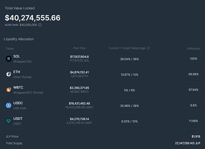 Jupiter Perpetual to protokół pochodny podobny do GMX V1 uruchomiony przez Jupiter Labs i obecnie znajduje się w fazie użytkowania. Użytkownicy protokołu dzielą się głównie na dostawców płynności i traderów. Płynność zapewniona przez dostawcę płynności jest przekształcana w koszyk tokenów (obecnie obejmujący BTC, ETH, SOL, USDC i USDT). Tokeny w puli o wyższych wagach to głównie SOL i USDC, czyli główny cel handlowy jest SOL.