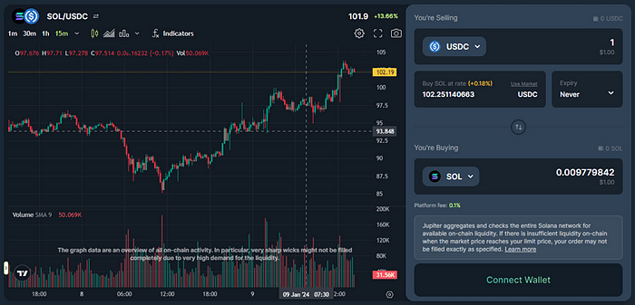 Jupiter zapewnia również funkcję zleceń z limitem, która pozwala uniknąć wzrostu kosztów i problemów z poślizgami spowodowanymi efektami cenowymi podczas transakcji (nie ma problemu MEV). Zlecenia z limitem mogą zostać częściowo wypełnione i otrzymać część tokenów handlowych bez pełnego wypełnienia. Podczas handlu użytkownicy mogą wybrać okres ważności zamówienia, cenę wymiany i ilość wymiany. Protokół współpracuje z Birdeye i TradingView. Birdeye dostarcza dane o cenach tokenów w łańcuchu, a Jupiter wykorzystuje technologię TradingView do wyświetlania danych na wykresach. Ogólne doświadczenie handlowe jest bardzo podobne do tego na scentralizowanej giełdzie.