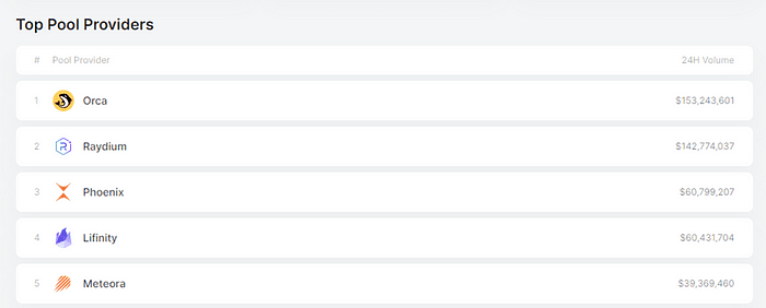 Jupiter obecnie agreguje płynność 29 protokołów, spośród których pięć protokołów o największej liczbie transakcji generowanych poprzez agregację transakcji to Orca, Raydium, Phoenix, Lifinity i Meteora. Pięć najważniejszych protokołów odpowiada za prawie 90% wolumenu transakcji Jupitera. Warto wspomnieć, że w skład zespołu Meteory wchodzą także Meow i Ben Chow. Poprzednikiem protokołu jest zdecentralizowana giełda Mercurial Finance. Po burzy z piorunami FTX firma Mercurial Finance ogłosiła zamknięcie, a posiadacze tokenów migawkowych otrzymają 20% tokenów Meteora, a Jupiter uruchomi tokeny/zwiększy płynność na Meteora. Obecnie Meteora zaczęła zapewniać plan motywacyjny dla inwestorów (10% z nich). tokeny przydzielone LP przed dodaniem płynności).
