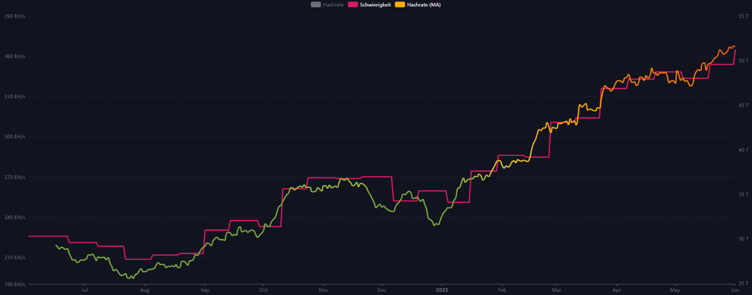 Zasadniczo jednak wszystko jest w porządku z Bitcoinem. Jeśli spojrzymy na przykład na hashrate, możemy zobaczyć pozytywne nastawienie rynku ze strony górników. W końcu hashrate wykazuje ogromny wzrost od miesięcy. Łączna moc obliczeniowa w sieci BTC wynosi obecnie 366 eksahaszów na sekundę (EH/S). Dla porównania, wartość ta wynosiła 241 EH/s jeszcze w styczniu.