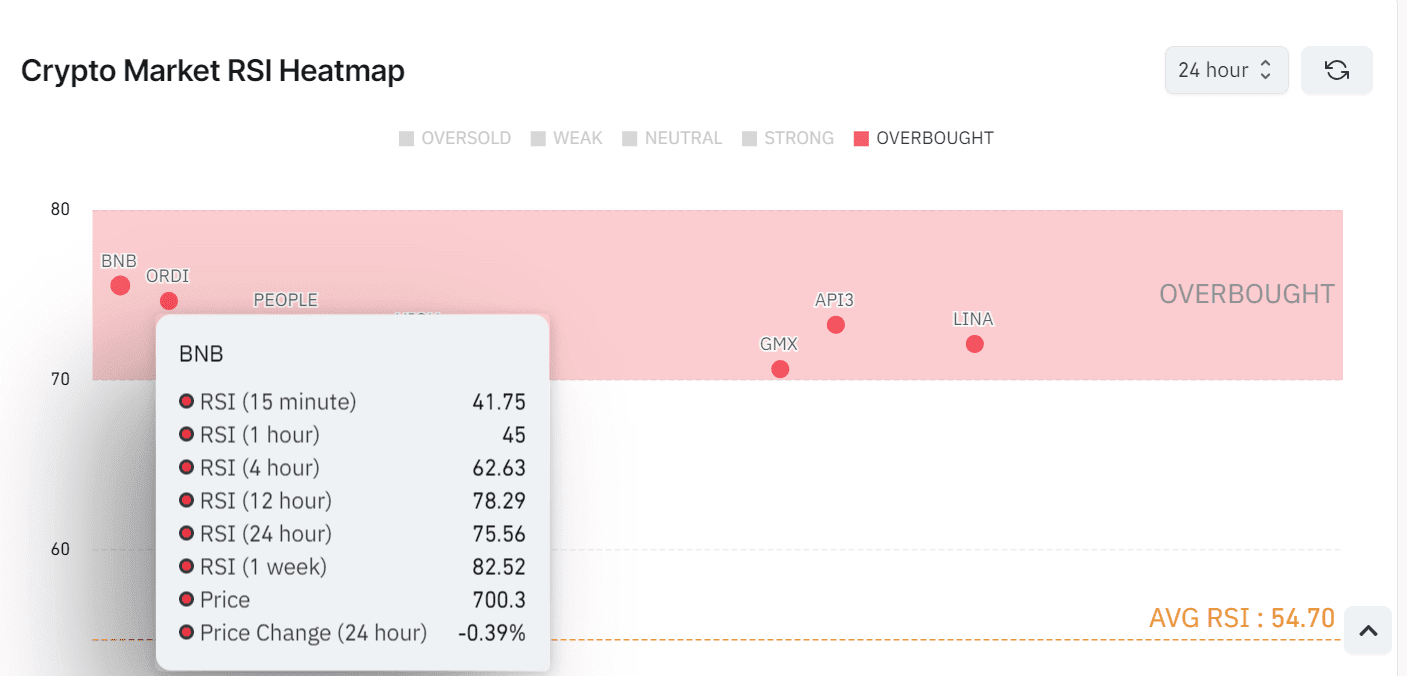 Rynek kryptowalut znajduje się obecnie w stanie ciągłych zmian pod wpływem szerszych czynników ekonomicznych. Najnowsze dane wykazały zaskakujący wzrost liczby miejsc pracy w USA, znacznie powyżej oczekiwań. Oznacza to, że gospodarka dobrze radzi sobie z wyższymi stopami procentowymi, zmniejszając prawdopodobieństwo obniżek stóp wpływających na przepływ pieniędzy w kierunku bardziej ryzykownych inwestycji, takich jak kryptowaluty są obecnie wykupione, mogą stanowić dobrą okazję do sprzedaży. Na podstawie 24-godzinnej mapy cieplnej indeksu siły względnej (RSI) CoinGlass z 7 czerwca, średni dzienny RSI wynosi 54,70, co wskazuje na neutralny rynek. Jednak kryptowaluty znacznie różnią się od tej średniej.🔸 Binance Coin #BNB)W momencie publikacji Binance Coin (BNB) jest notowany na poziomie 700,30 USD, co stanowi niewielki spadek ceny o 0,39%. Odczyty RSI BNB w różnych okresach pokazują, że doszło do wykupienia, szczególnie w ciągu ostatnich 24 godzin. 24-godzinny RSI dla BNB wynosi 75,56, czyli powyżej progu wykupienia wynoszącego 70. Wskazuje to na silną presję kupna, która może być zmienna. 1-tygodniowy RSI na poziomie 82,52 wskazuje na przedłużające się wykupienie, wskazując na potencjalną korektę cen. BNB osiągnął niedawno najwyższy poziom w historii, podkreślając możliwe przewartościowanie i nasycenie rynku 🔸 Ordi #ORDI)ORDI, pierwszy token wybity w standardzie BRC-20, również wykazał znaczne ruchy cen. ORDI jest obecnie wyceniony na 62 888 dolarów, co oznacza wzrost o 8%. Wartości RSI ORDI również wskazują na wykupienie. 24-godzinny RSI dla ORDI wynosi 74,65, co wskazuje, że nastąpiło niedawno wykupienie. ORDI wzrósł o prawie 17% do nieco poniżej 57,5 dolarów, co jest najwyższą ceną od początku kwietnia. Ten szybki wzrost w połączeniu z wysokimi odczytami RSI sugeruje, że ORDI może wkrótce doświadczyć korekty cen w miarę stabilizacji rynku ORAZ BNB, a ORDI wykazuje wysoki RSI. poziomach, sygnalizując, że są obecnie wykupione i mogą być gotowe na korektę cen.