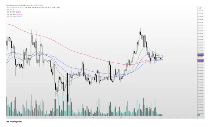 👉 O gráfico conta uma história interessante. O Bitcoin subiu fortemente no início de janeiro, ultrapassando os $94.000 antes de recuar. Desde então, tem se movido lateralmente, mantendo-se firme acima da EMA de 200 períodos, enquanto as EMA mais curtas se aplanam e se ajustam. Essa compressão geralmente significa que compradores e vendedores estão igualmente equilibrados — o impulso está esfriando sem que ninguém ceda terreno. O volume também caiu em comparação com os movimentos explosivos anteriores, confirmando que estamos em uma fase de consolidação e não enfrentando uma reversão de tendência.