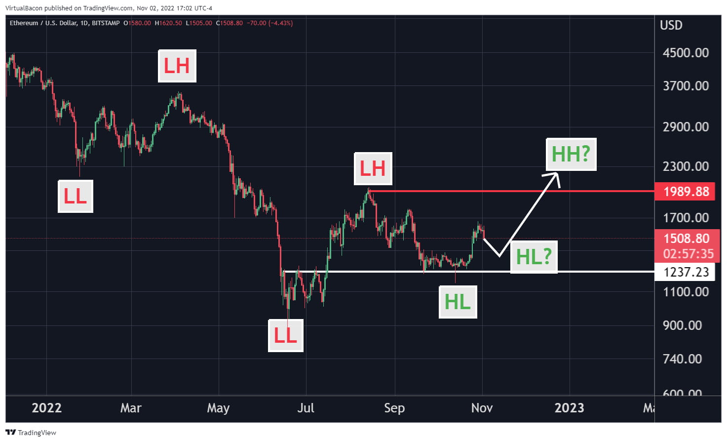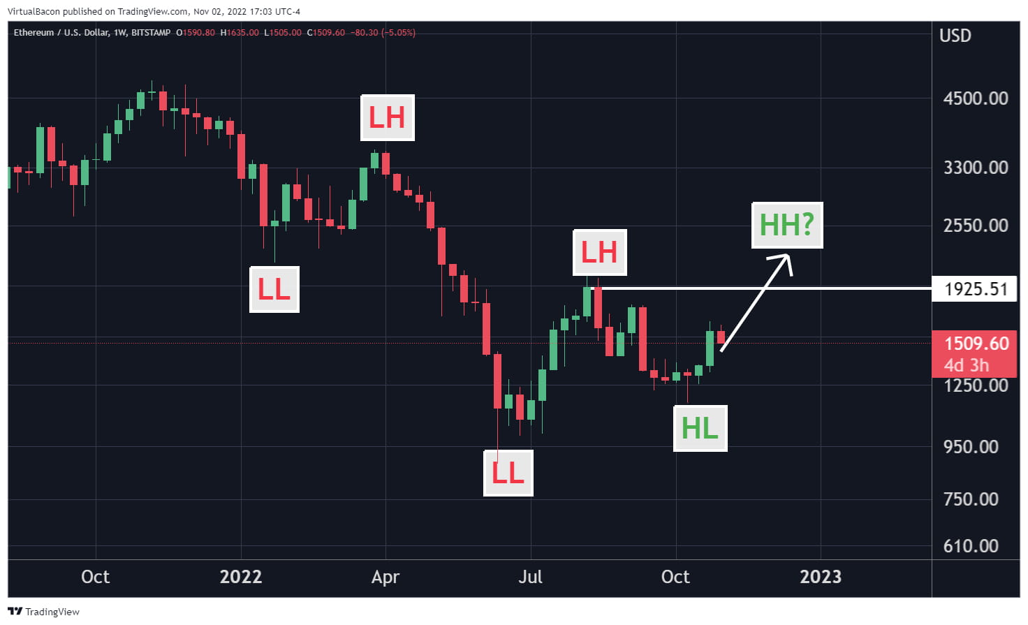 Conforme discutido na semana passada, para que o Ethereum saia de sua tendência de baixa, ele precisa atingir um mínimo mais alto seguido de um máximo mais alto. Este é o sinal clássico de reversão de uma tendência de baixa para uma nova tendência de alta.