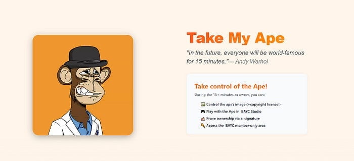 Seu último projeto, um protótipo chamado “Take My Ape,” é mais do que apenas um experimento típico. Está nos dando uma visão do futuro dos aluguéis de NFT, onde você pode alugar temporariamente um NFT do Bored Ape Yacht Club (BAYC) 🐵 e desfrutar de todos os privilégios associados.