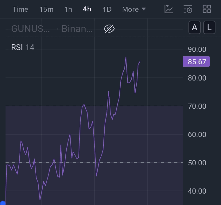 O Índice de Força Relativa (RSI) do GUNUS Coin na Binance atingiu 85.67, indicando que a criptomoeda está em território de sobrecompra. Isso sugere que o preço pode estar prestes a passar por uma correção ou consolidação.