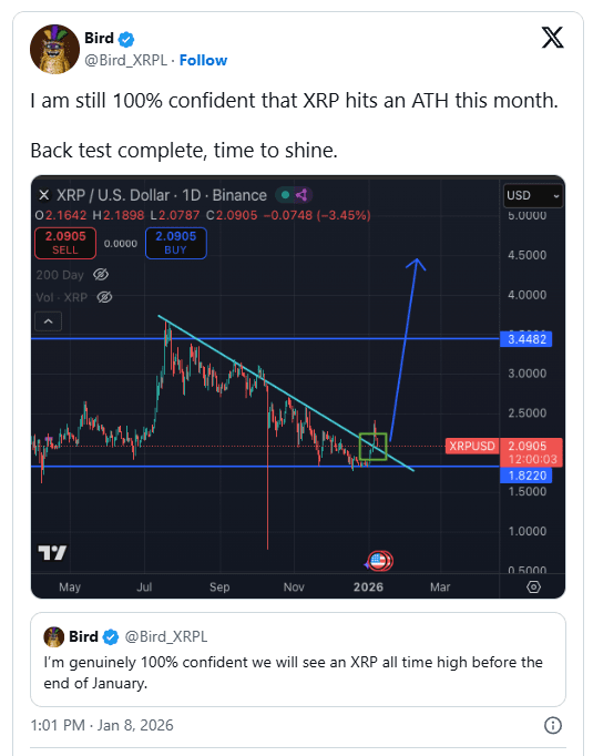 A confiança do Bird está centrada na conclusão. O ativo realizou com sucesso um teste reverso, e um breakout restrito com volume forte poderia validar a previsão. Se o XRP continuar acima de $2 e da linha de tendência descendente, a estrutura do gráfico favorece a continuidade rumo a níveis mais altos de resistência.