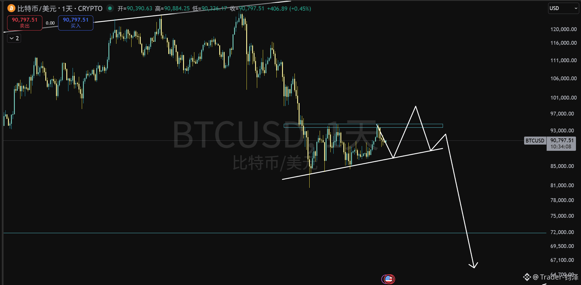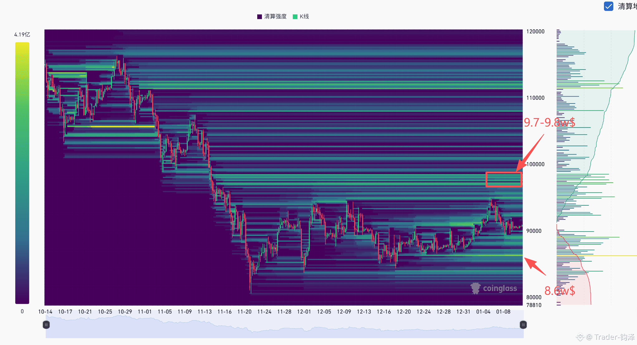 结论:清算8.65W左右的多头,再回头打两个月的空头,9.7-9.8W区间,对于抄底和做空,我都是建议右侧做,在关键价格区间走出一定扎针、震荡横盘、V反回落等再出手