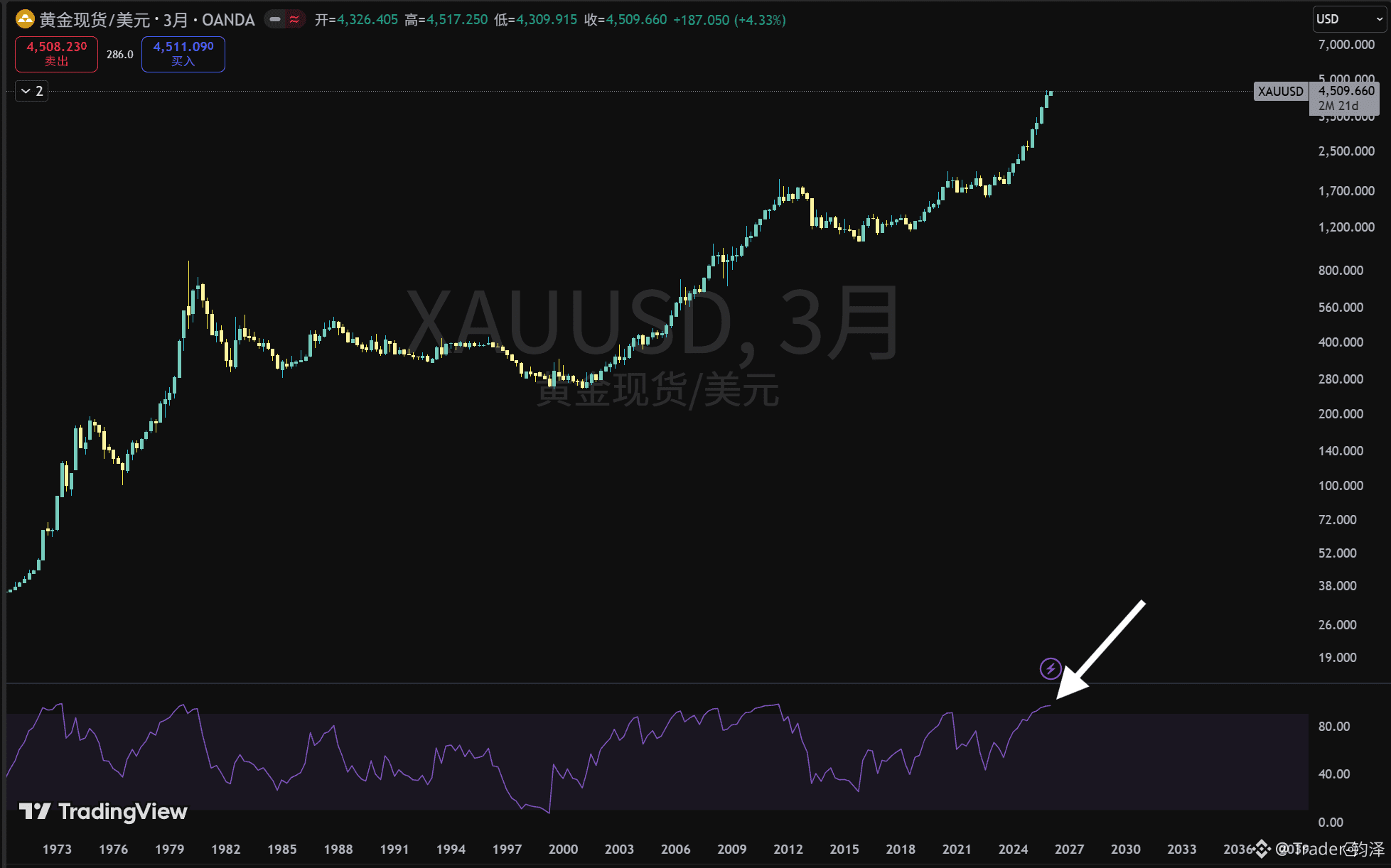 黄金三月线RSI(6)已经进入历史最高超买