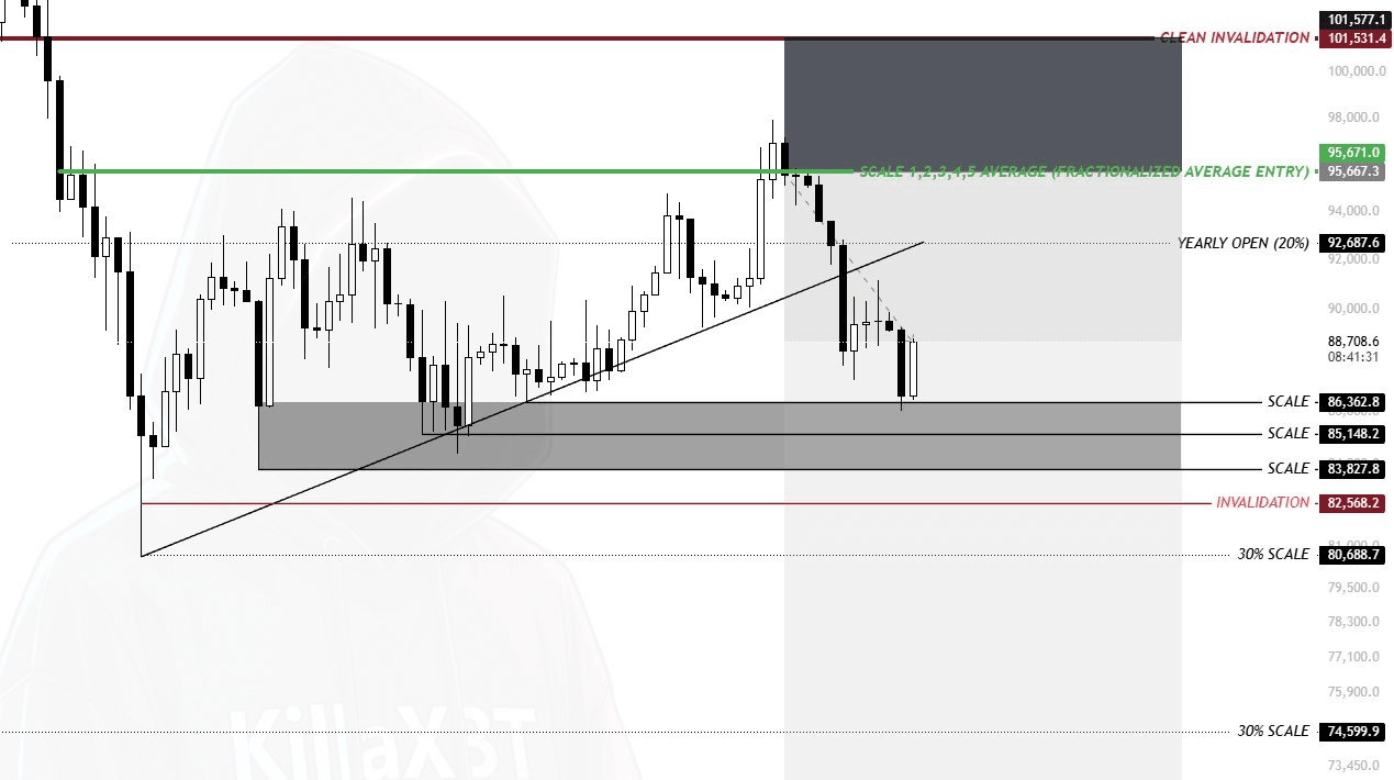“Acredito que a extensão máxima esteja em torno de 89–91K antes de mais desvalorização,” escreveu o trader Killa em sua mais recente postagem no X.
