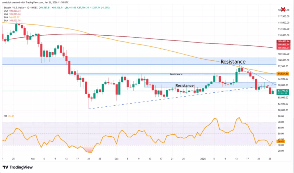 A IG deu áreas de resistência em torno de $94.000 e $100.000 como metas de longo prazo, com $86.000 ainda importante a evitar em caso de uma nova queda.