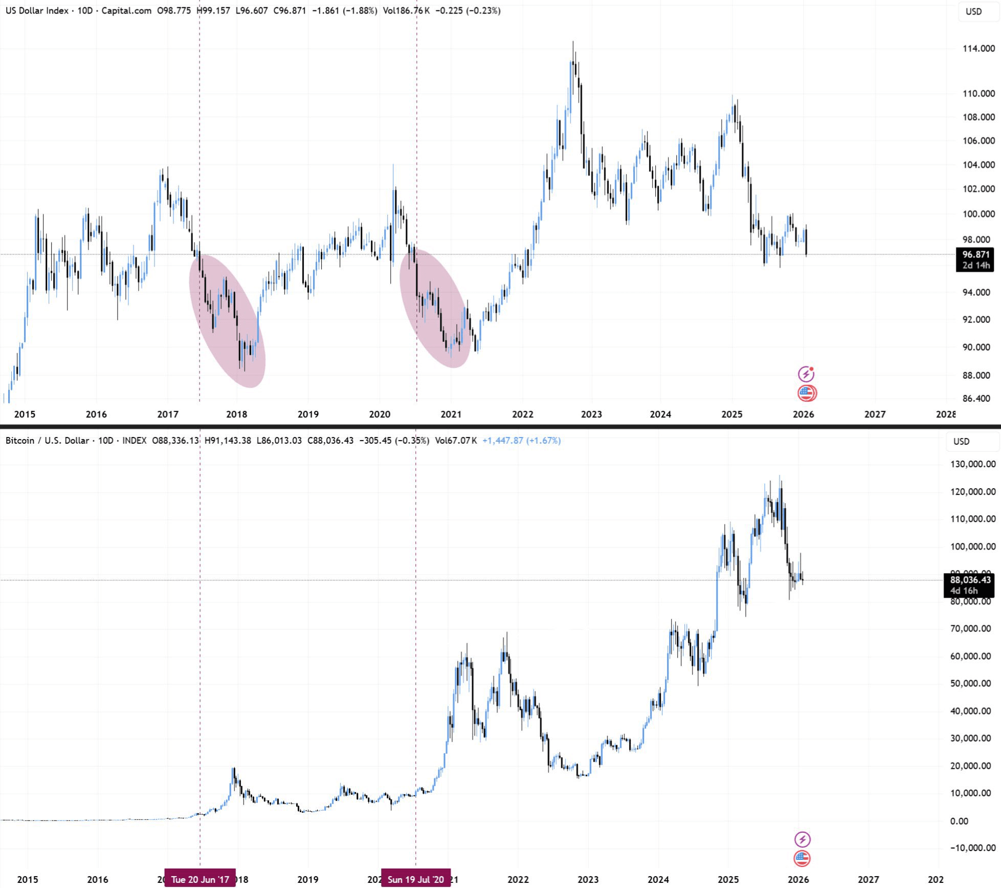 Índice do dólar dos EUA (DXY) vs. gráfico de 10 dias BTC/USD. Fonte: BitBull/X
