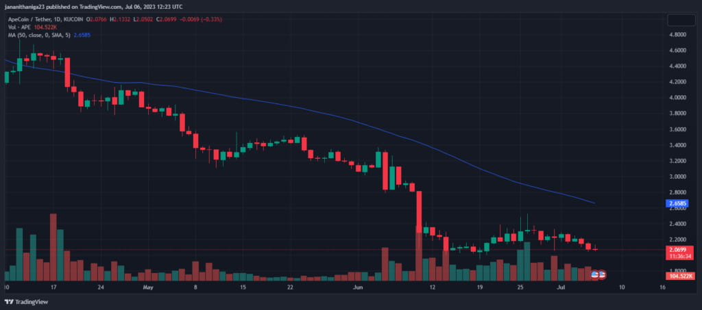 Numa reviravolta chocante, o ApeCoin (APE), o token de utilidade e governação do ecossistema APE, quase caiu para o seu nível mais baixo este ano. O preço do ApeCoin atingiu impressionantes US$ 1,99 este mês, marcando um declínio significativo para os investidores. A tendência de queda ficou evidente ao longo do mês, com queda de 34,04% e queda de 6,13% apenas nesta semana.