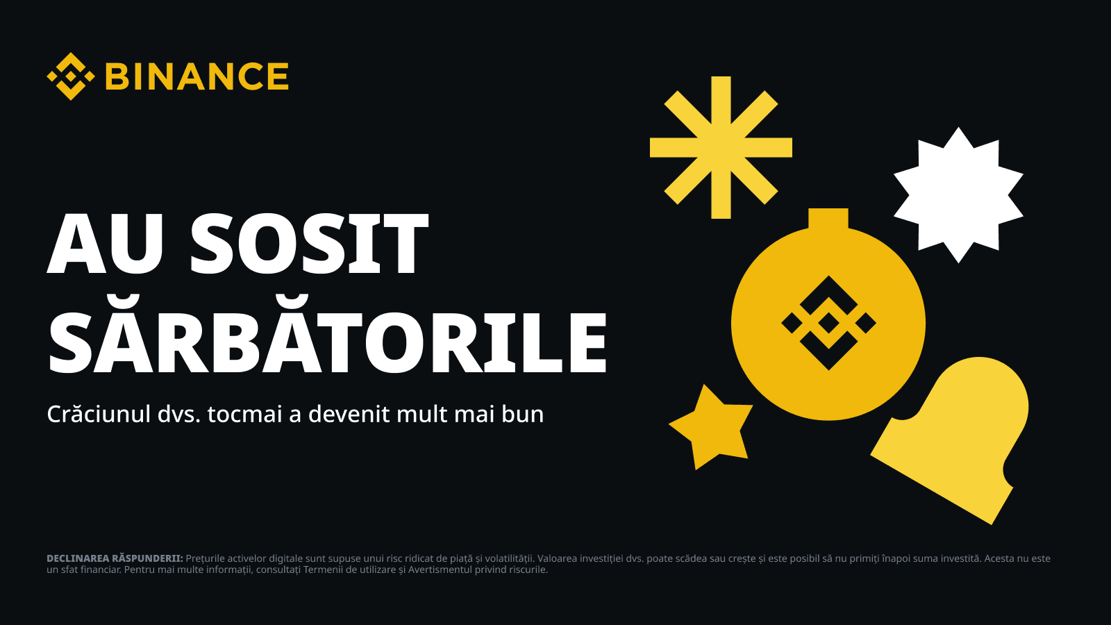 Oricare ar fi planurile dvs. pentru luna decembrie, vă urăm un sezon festiv plin de bucurie și memorabil. Nu ratați — nu uitați să verificați zilnic Calendarul de Crăciun în perioada 10 decembrie - 24 decembrie pentru activități interesante și șansa de a împărți recompense în valoare de peste 990.000 USD. Sărbători fericite tuturor celor care fac parte din familia Binance!