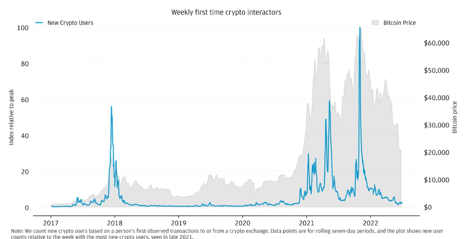 Numărul săptămânal de noi utilizatori cripto și graficul prețului Bitcoin:
