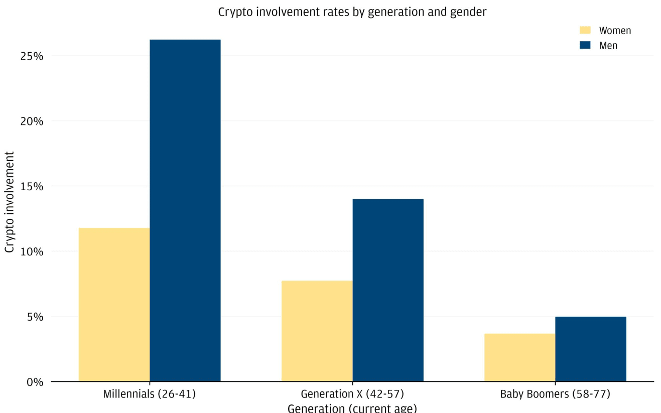 După vârstă, cercetătorii au descoperit că cea mai mare pondere a investitorilor cripto este printre mileniali - 20% față de 11% în generația X și doar 4% în rândul baby boomers. În toate grupurile, bărbații sunt mai implicați în noua clasă de active.
