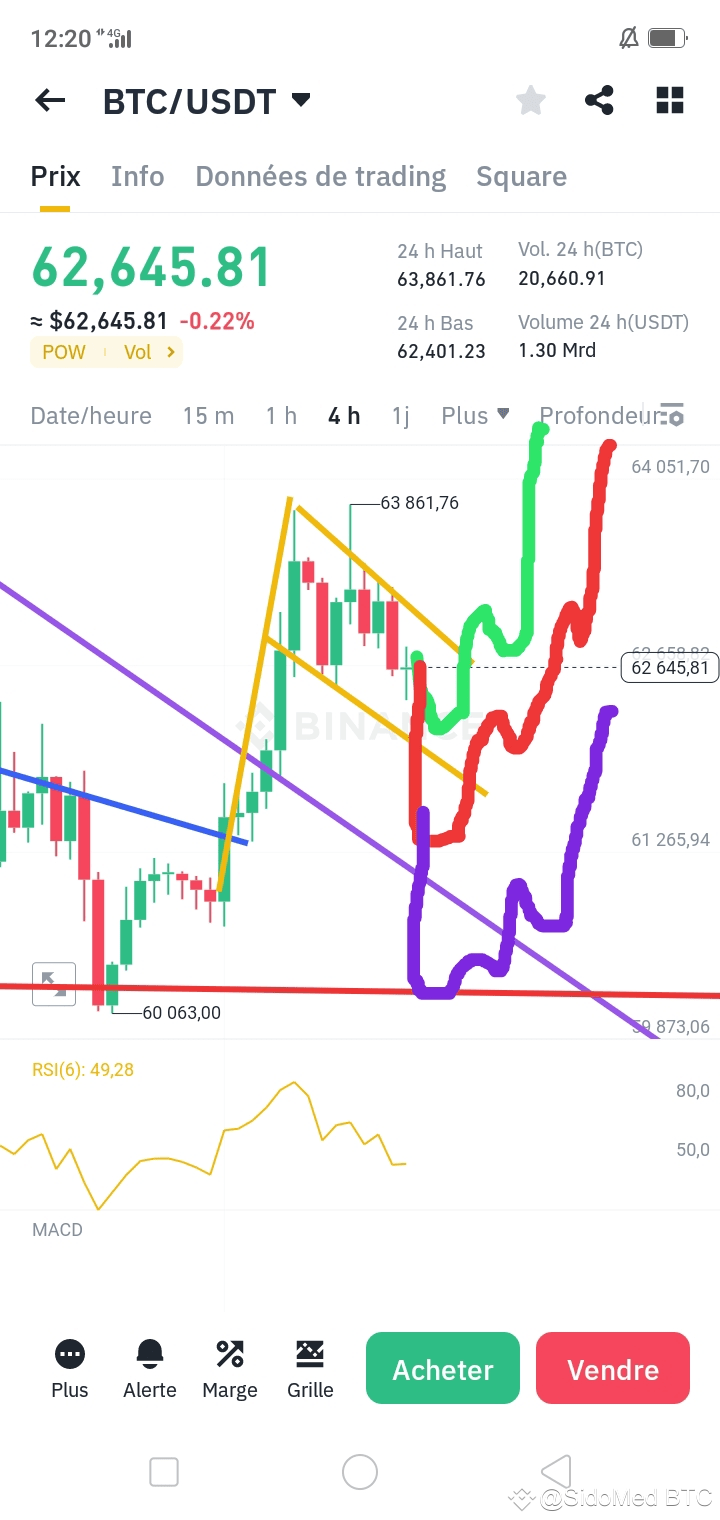 ..//إذن على مدى 4 ساعات الحركة السعرية البيتكوين بدأت في تشكيل نمط العلم، وإذا تم كسره للأعلى فسيكون الهدف التقني الكامل هو مستوى 65,200$، وكنا قلنا سابقا اجتياز مستوى 65,000$ معناه أن البيتكوين سيكون صعودي وبقوة ويمكن أن نرى قمة تاريخية جديدة تتجاوز مستويات 76,000$ وصولا إلى مستويات تتجاوز 80,000$، لكن كل هذا يعتمد على بقاء البيتكوين فوق مستوى 65,000$...