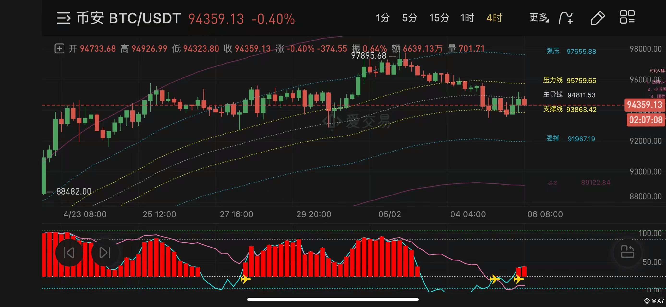 ◦ 阻力压制:短期压制位于95,500美元附近,若突破需配合成交量放大(单小时买盘≥5,000 BTC),否则可能形成假突破。