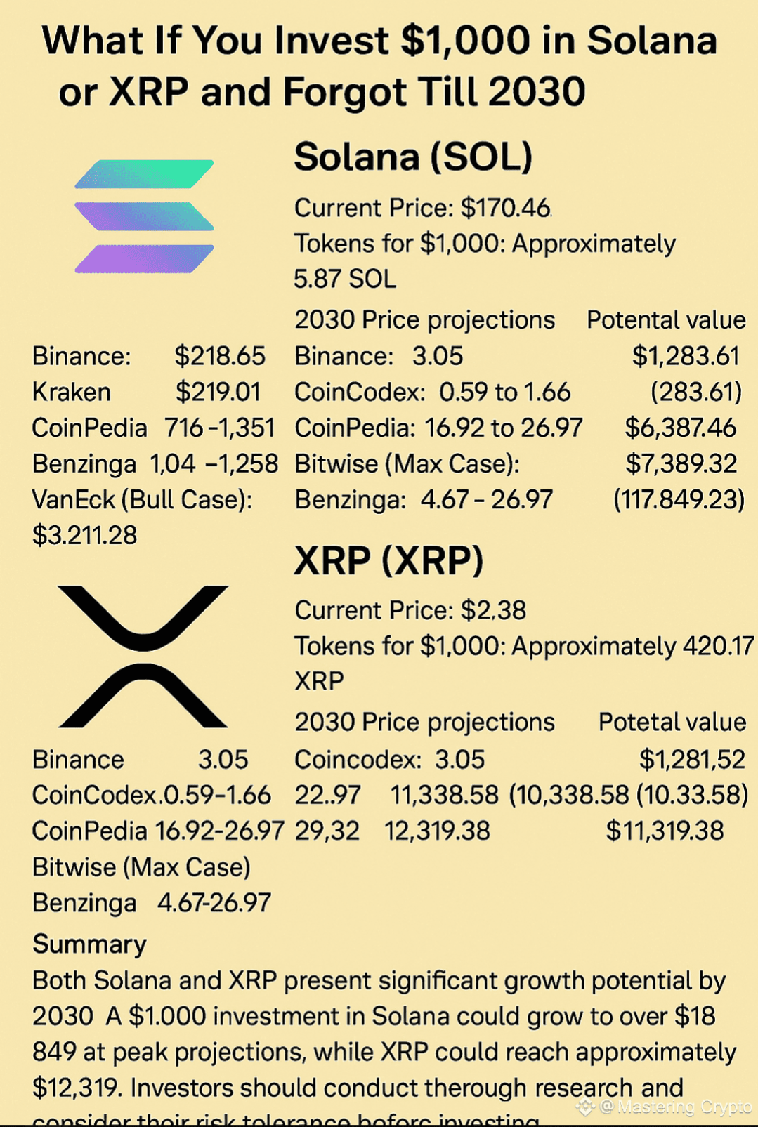 Începând cu 9 mai 2025, iată o analiză actualizată a unei investiții de $1,000 în Solana (SOL) și XRP, pe baza prețurilor curente și a proiecțiilor pentru 2030.