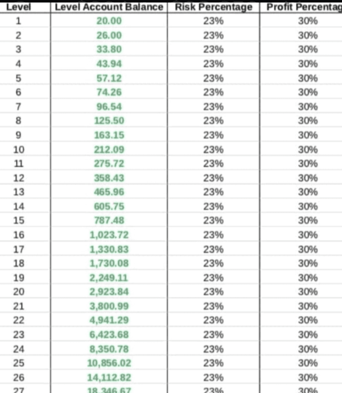 ...continuă acest proces până la Nivelul 28, iar contul tău ar putea ajunge la $23,850.67.