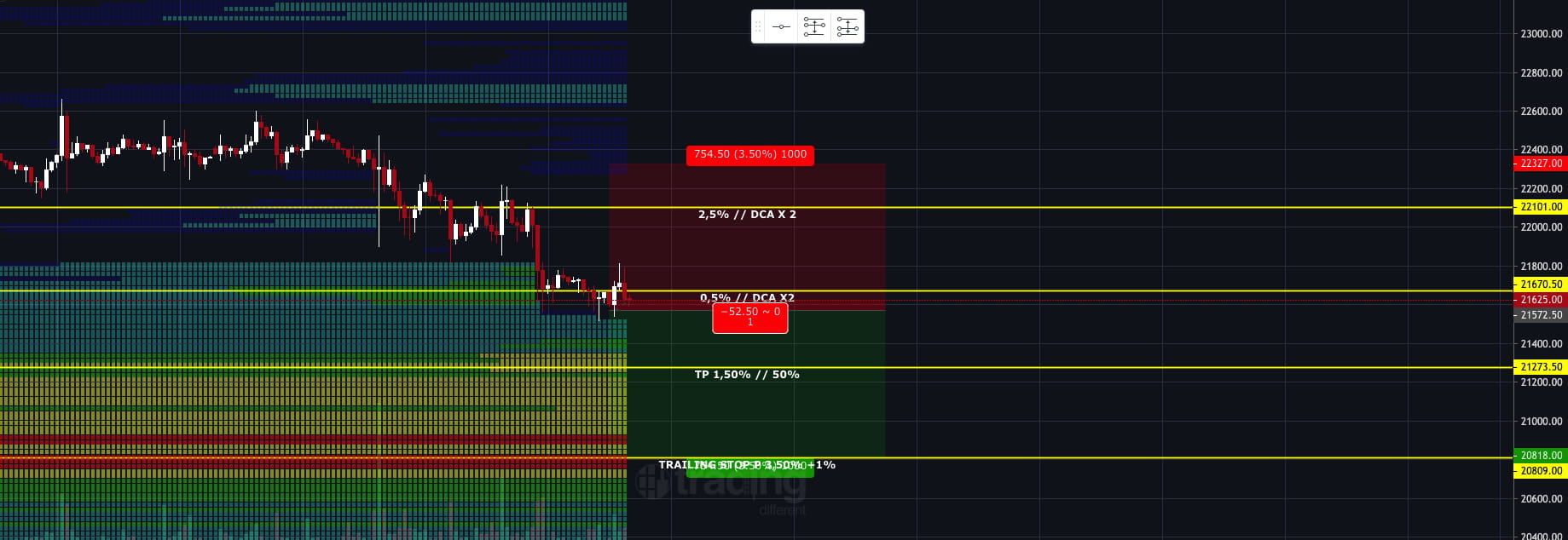 We have a second DCA at the price of 22,101 USDT (2.5% from the entry price) with 100% of the previous balance, which would result in a leverage of X2 if that price is reached. We have also set a total stop loss of 22,327 USDT (3.5% from the initial entry price).