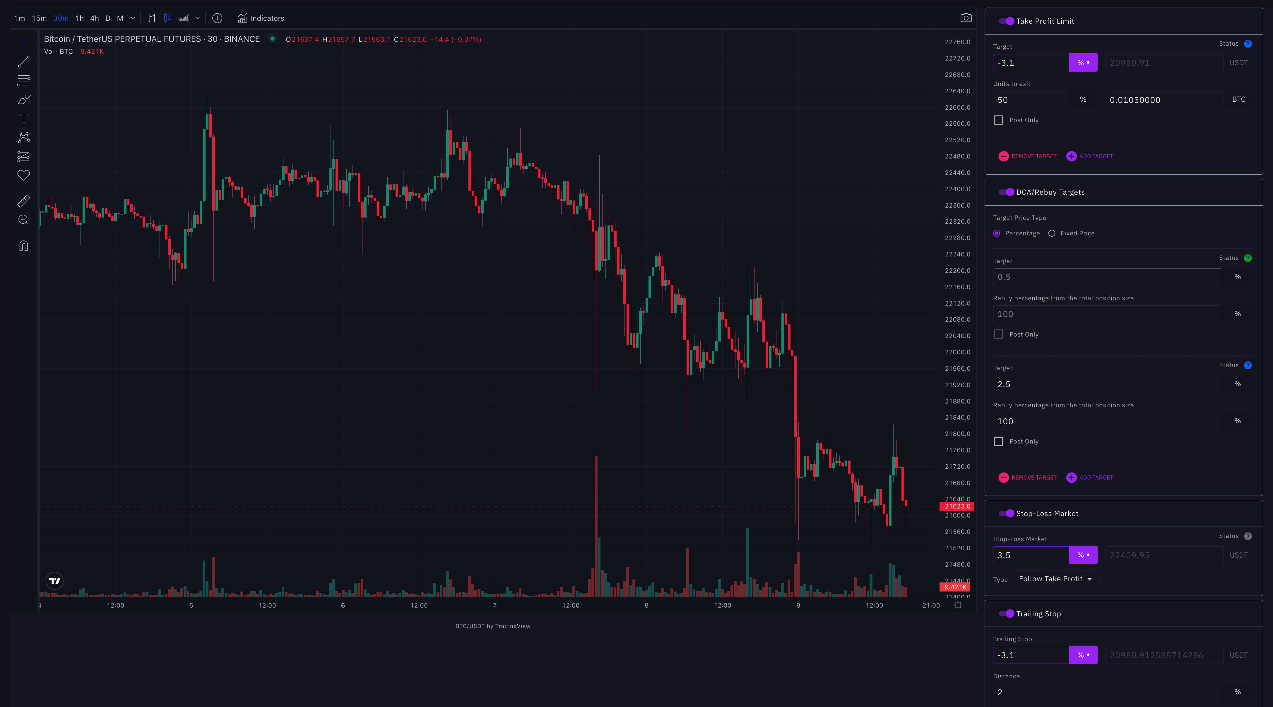 In this case, we have opened a short position in the BTC/USDT pair, using 50% of our total capital. We entered the market at a price of 21,574 USDT, with an active DCA of 100% of the initial capital at 0.5%, which allows us to weigh the entry price at 21,624.06 USDT with a leverage of X1.