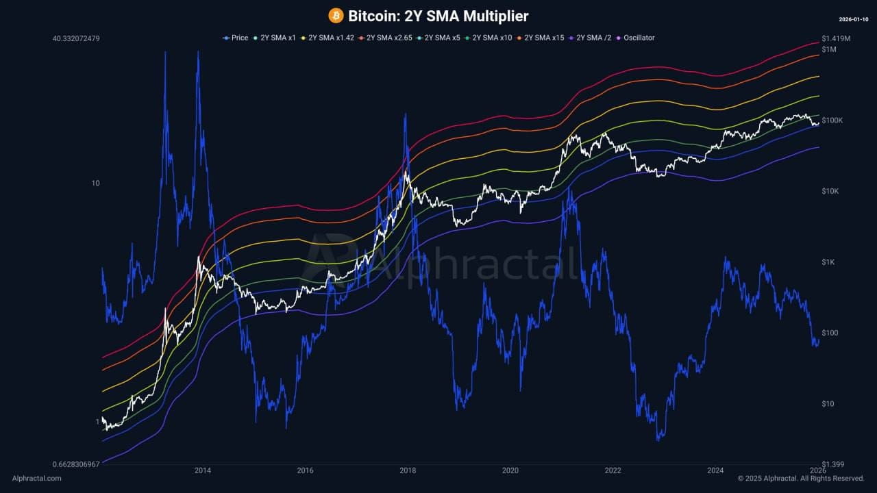Al doilea indicator este media mobilă pe două ani a prețului Bitcoinului, care este acum de aproximativ 84.500 de dolari. Pentru începători, acesta poate fi perceput ca unul dintre principalele «puncte de sprijin pe termen lung». În istorie, pierderea acestui nivel a dus adesea la intensificarea vânzărilor și la o corecție mai profundă. În prezent, prețul rămâne deasupra — piața este încă în zona de control, dar nivelul necesită atenție.