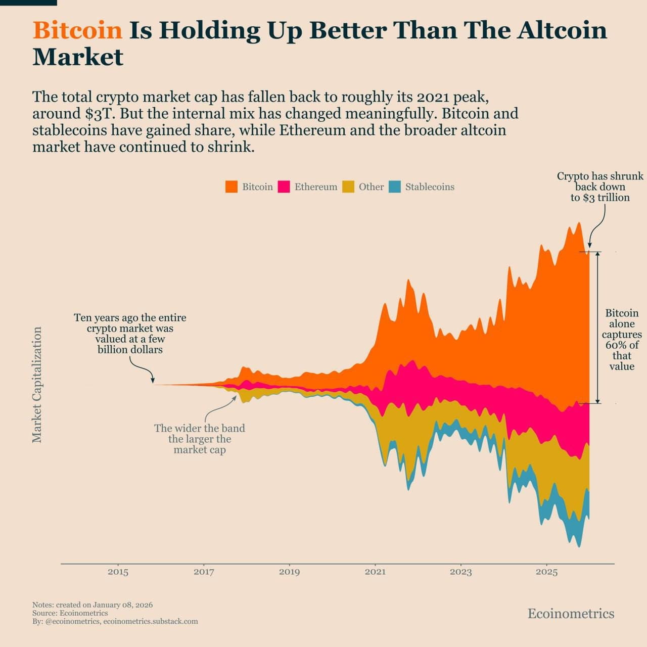 Dacă privim mai larg, piața s-a schimbat cu adevărat. Capitalizarea totală a scăzut cu aproximativ un sfert față de valorile maxime, dar aceasta nu este doar o corecție a prețurilor. Structura capitalului se deplasează: ponderea Bitcoinului și a stablecoinurilor crește, în timp ce interesul pentru Ethereum și piața largă a altcoinurilor slăbește. Banii se concentrează în active cu o logică mai clară și o utilizare pe termen lung.