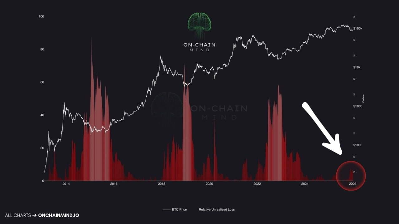 Primul moment important este indicatorul de pierderi ne-realizate relative. Acesta arată ce procent din toate Bitcoinurile se află în minus față de prețul de cumpărare. Cu alte cuvinte, câte monede se află acum în pierdere în posesia deținătorilor. În trecut, în scăderile serioase, acest indicator depășea frecvent 50%, ceea ce însemna durere masivă și capitulare. În prezent, nici măcar nu am ajuns la 10%. Acest lucru indică faptul că majoritatea deținătorilor sunt încă în profit, deci presiunea fricii asupra pieței este încă limitată.