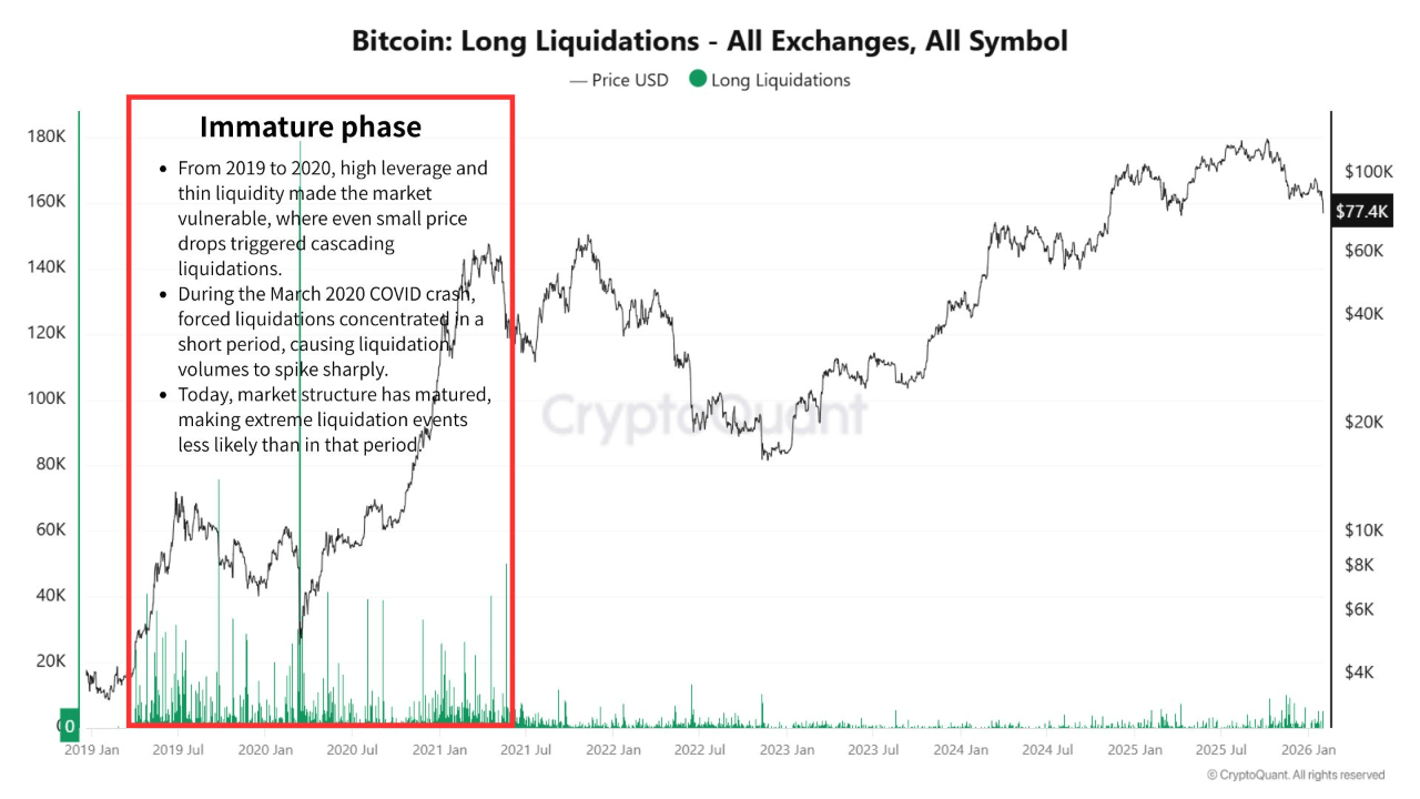 Așa cum arată graficele CryptoQuant, în perioada 2019–2020, piața derivatelor era imatură, cu leverage mare și lichiditate redusă. Chiar și scăderi mici au provocat lichidări lungi în cascadă, culminând cu prăbușirea COVID din martie 2020, unde vânzările forțate au amplificat colapsul.