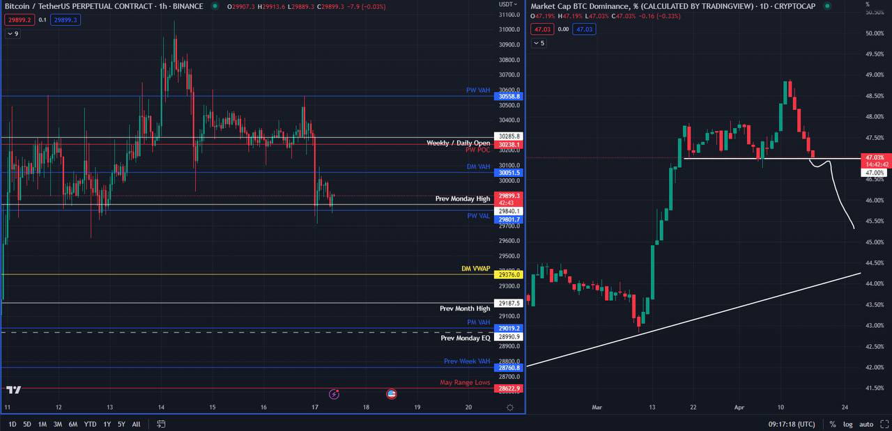 Actualizare zilnică Crypto - Bitcoin pierde Developing Month Value Area High (DM VAH) și se confruntă cu rezistență la 30.000 USD.