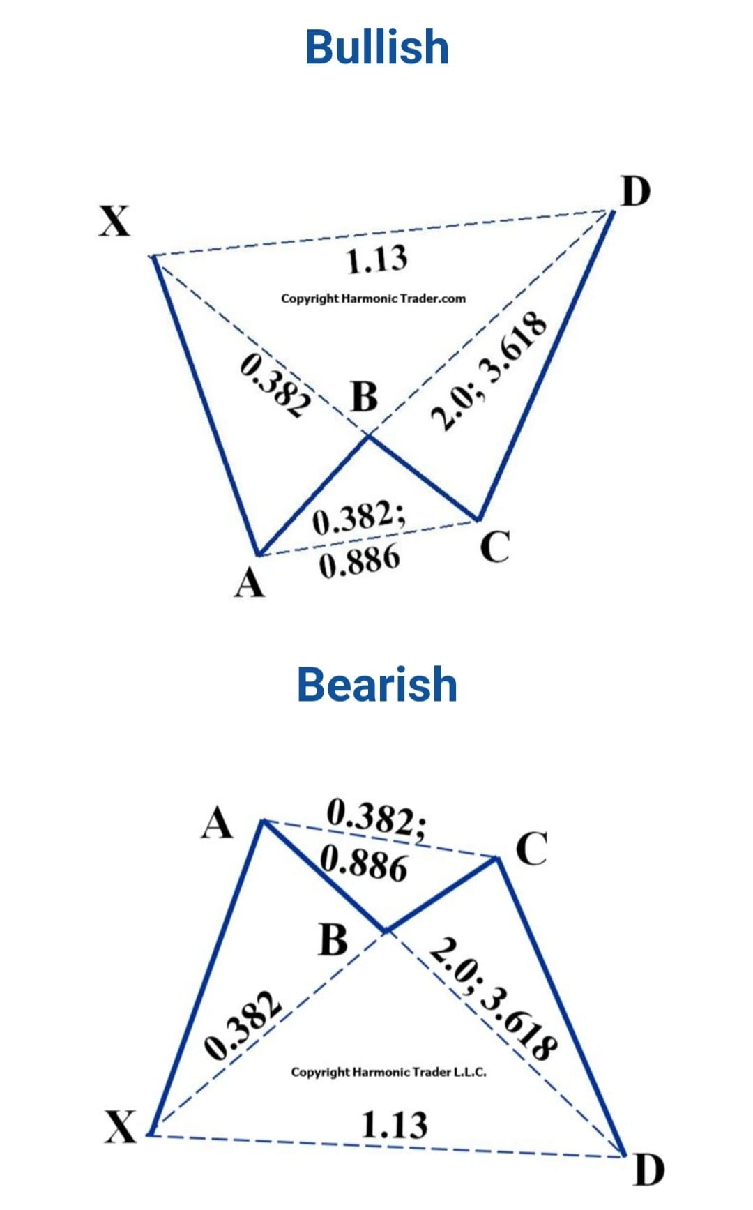 Retragerea punctului B trebuie să fie o retragere de 0,382 sau mai mică a piciorului XA. Alternate Bat pattern™ utilizează o proiecție de minim 2,0BC. În plus, modelul AB=CD™ din cadrul Alternate Bat este întotdeauna extins și de obicei necesită un calcul de 1,618 AB=CD.