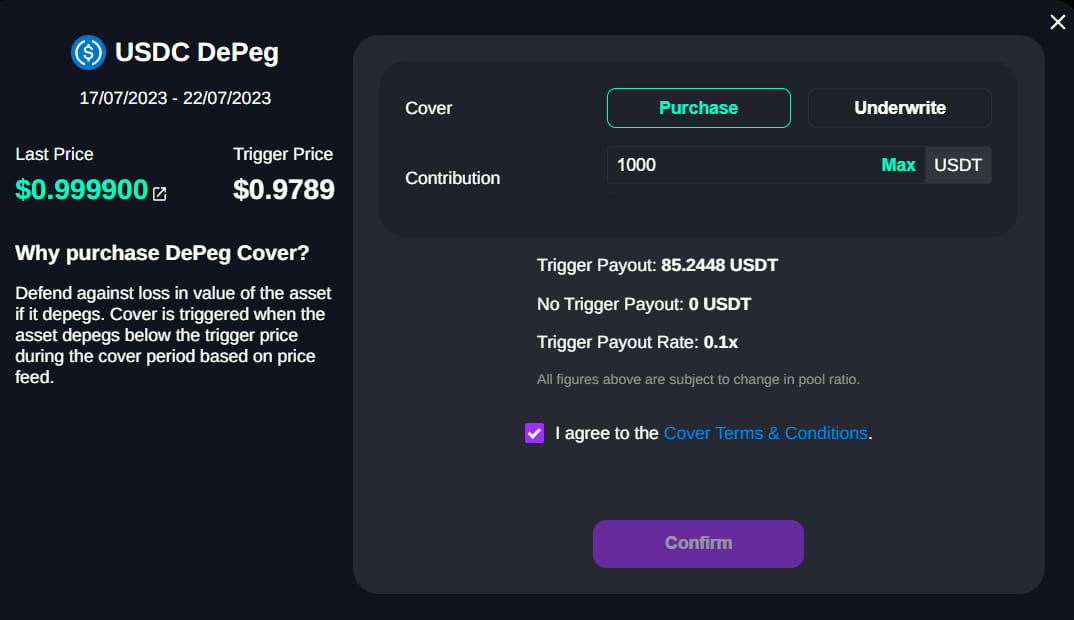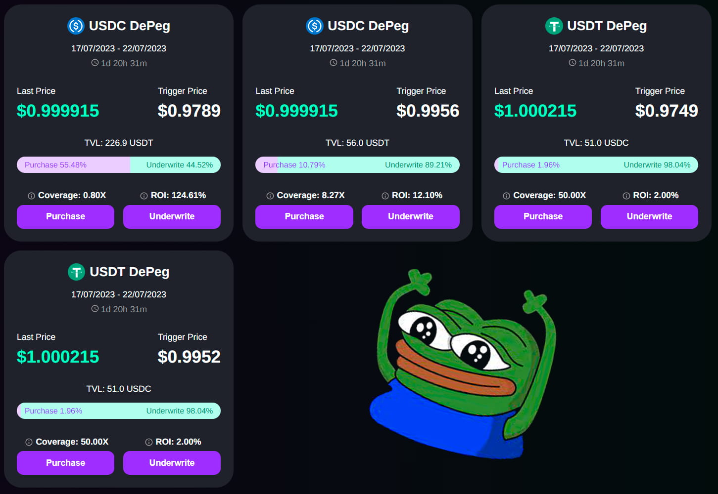 Atunci când achiziționează coperți, utilizatorii își depun USDC sau USDT într-un seif unde activele vor fi protejate. În cazul depeg stablecoin și declanșarea prețului de declanșare, utilizatorul primește o plată de declanșare.