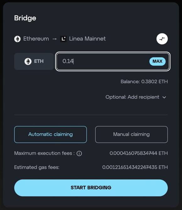 5/ Transferați niște ETH în rețeaua Linea folosind podul oficial