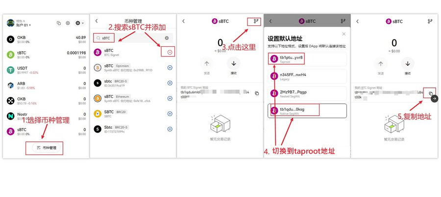 3. Ultima sarcină este să completați adresa Sign BTC pentru a obține jetonul de test airdrop $sBTC (deschideți portofelul OKX, faceți după cum urmează și copiați adresa care începe cu tb1p pentru a o completa)