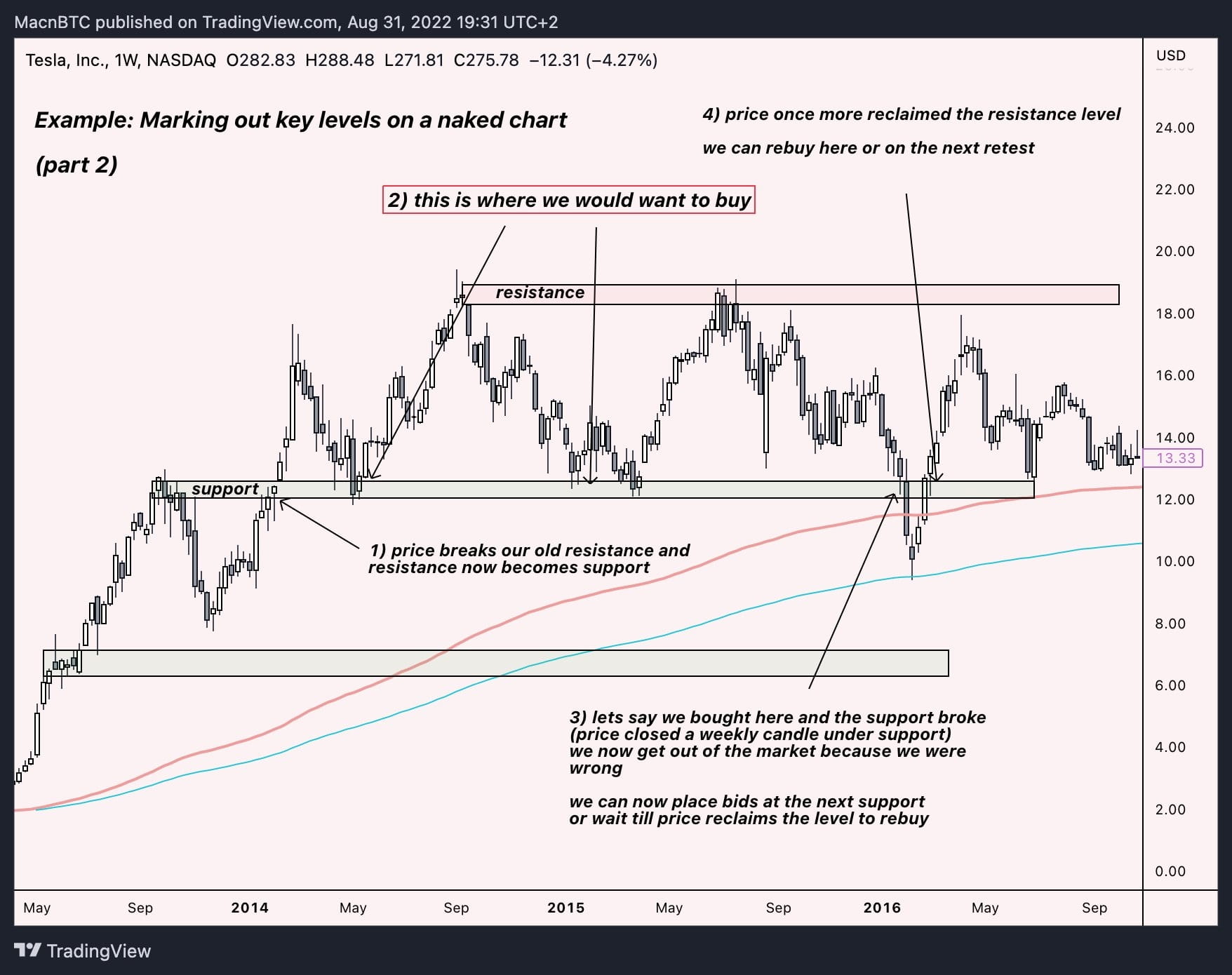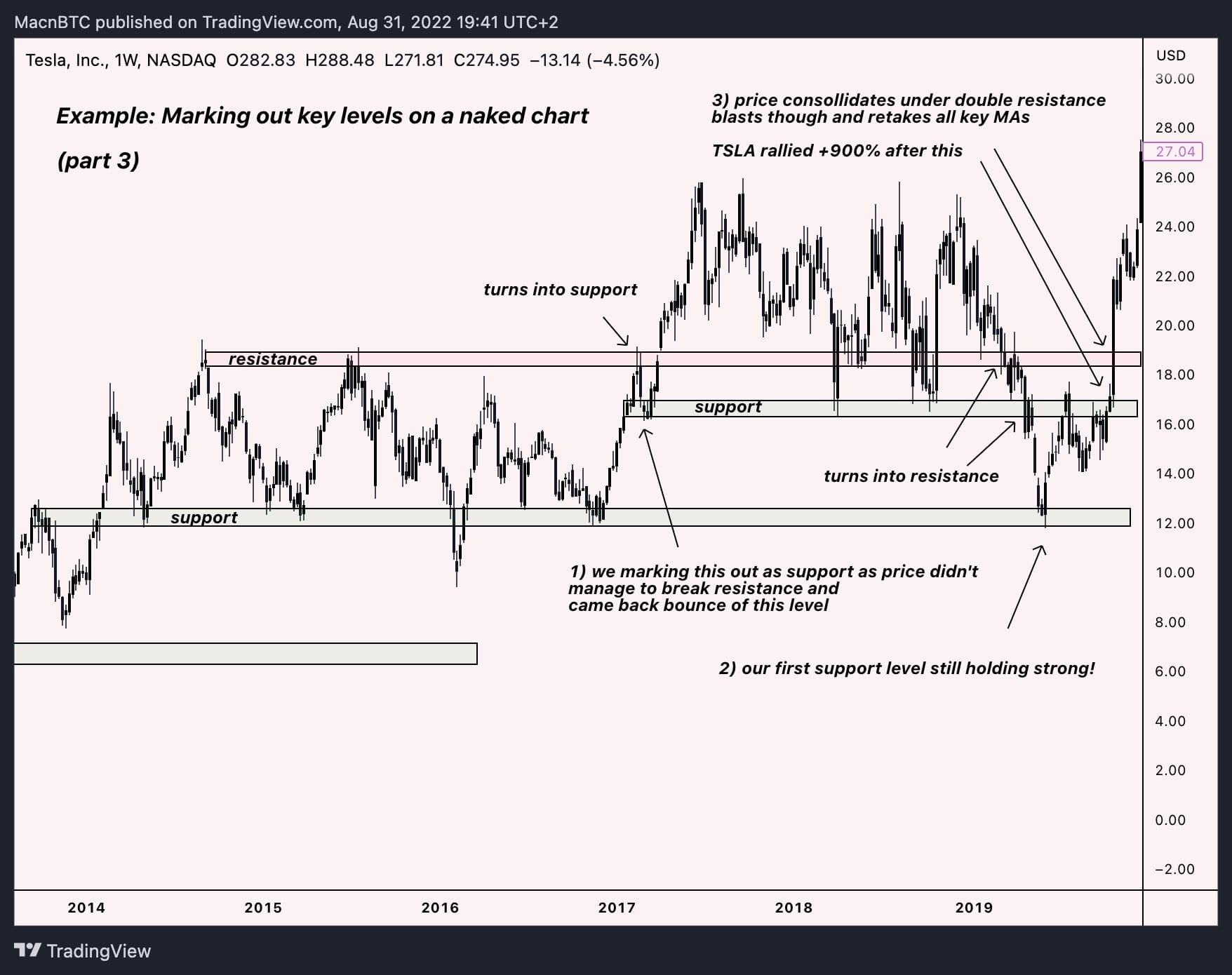 Часть 3: Продолжаем отмечать новые уровни поддержки/сопротивления. Обратите внимание, как они превращаются из поддержки в сопротивление и наоборот. Изучите, как цена консолидируется под действием двойного сопротивления, пробивает через них все ключевые скользящие средние и начинает ралли.