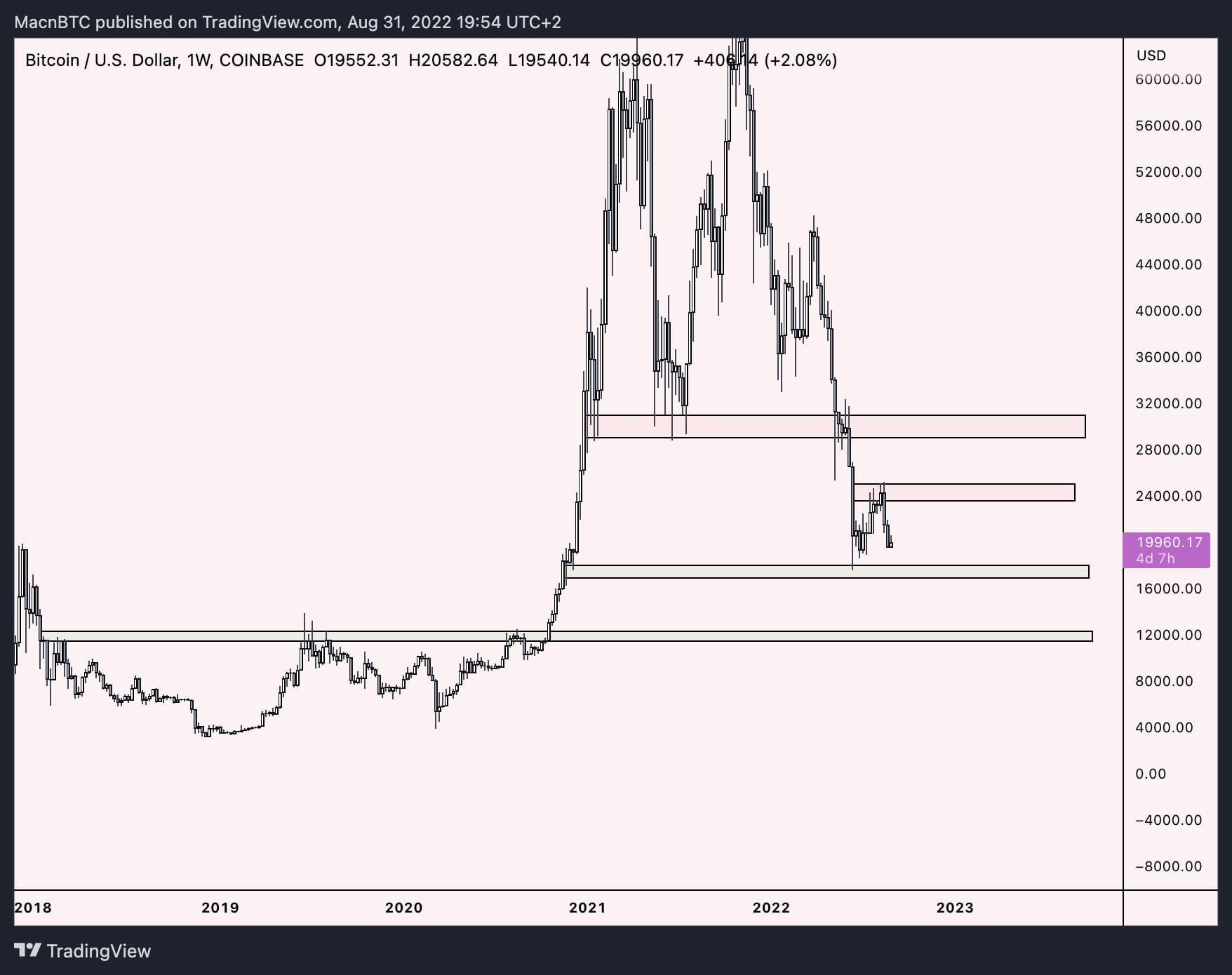 Давайте посмотрим еще на один пример $BTC на большом таймфрейме и отметим ключевые области поддержки/сопротивления. Небрежное быстрое обозначение ближайших уровней поддержки/сопротивления на голом графике 1W $BTC.