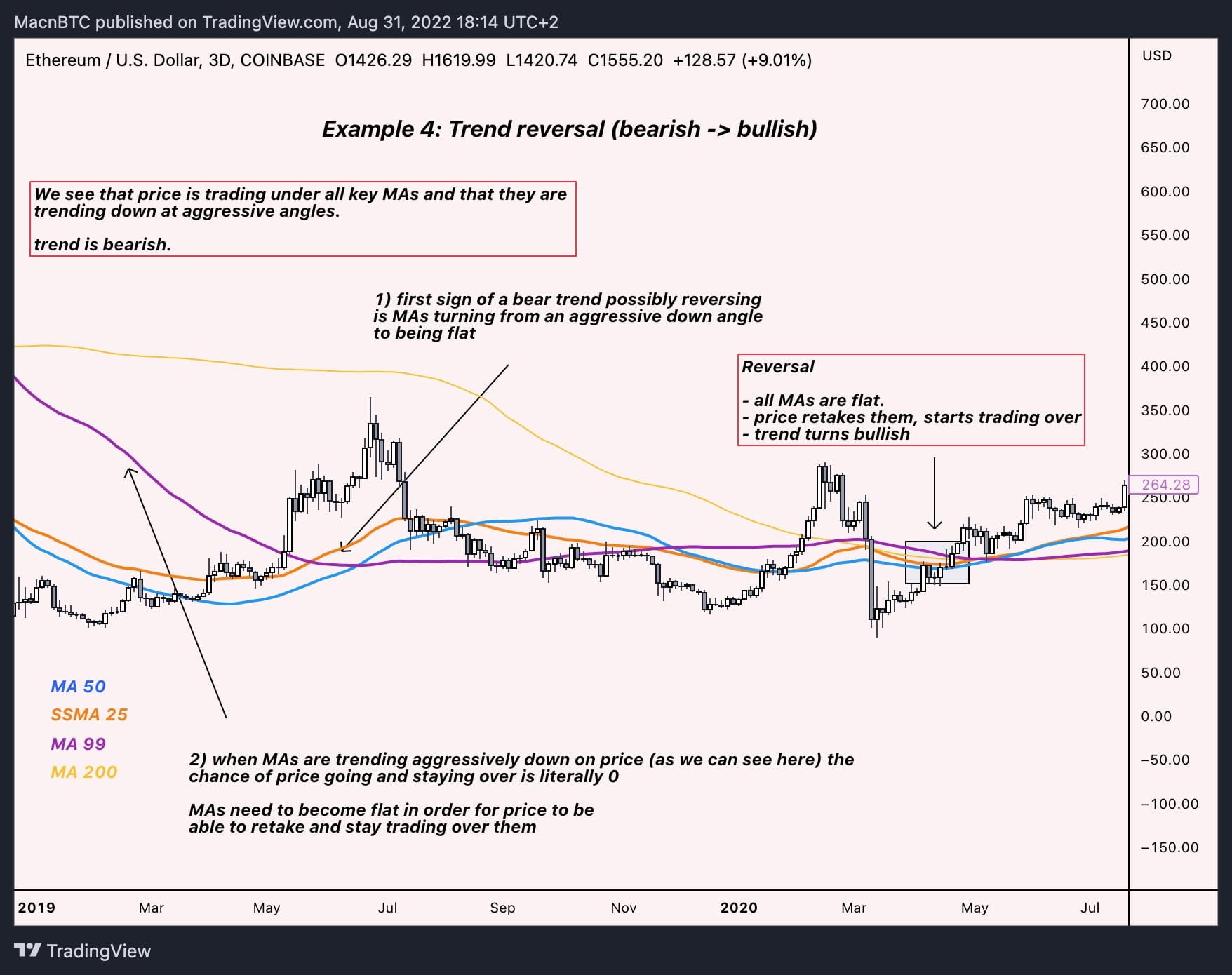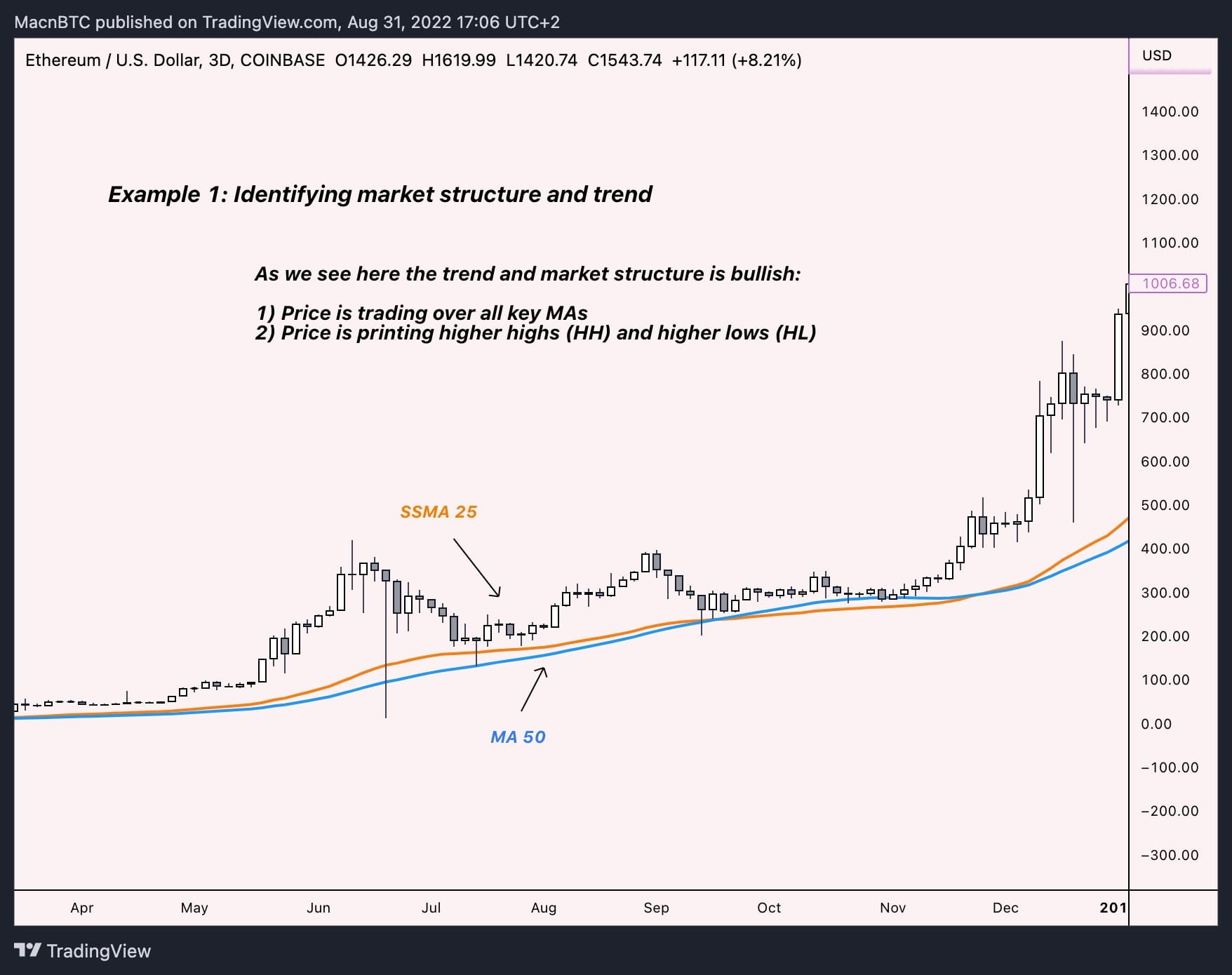 Хорошо, поехали! Это $ETH на трехмерном таймфрейме с SSMA 25 и MA 50. Я буду использовать только две скользящие средние, чтобы уменьшить шум на графике. Это пример бычьего тренда и структуры рынка. Нажмите на график и прочитайте примечания.